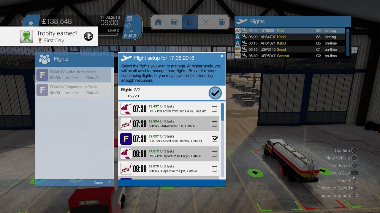 Once you’re happy with how you’ve spent/wasted your money, hold R1 or L1 and tap right on the Left stick to move to your ‘flights’ menu. This shows you what flights you added to your workload and lets you see the time they are due in/to leave and a shadow of what vehicles are needed. I would have liked it if it told you what the vehicles were so you could think ahead and forward-plan, but nevermind. The game can operate in various time modes from x0 all the way up to x20. Yes, x1 is real-time – so 1 hour in-game will take 1 hour in real life. Airport Simulator 2014 never had any speed options so we all modded the game back then in order to give us a speed boost, thankfully we don’t have to with the 2019 iteration. There is also a handy ‘Next Event’ button (Triangle) which when pressed will skip time all the way up until the next plane’s first task is available!