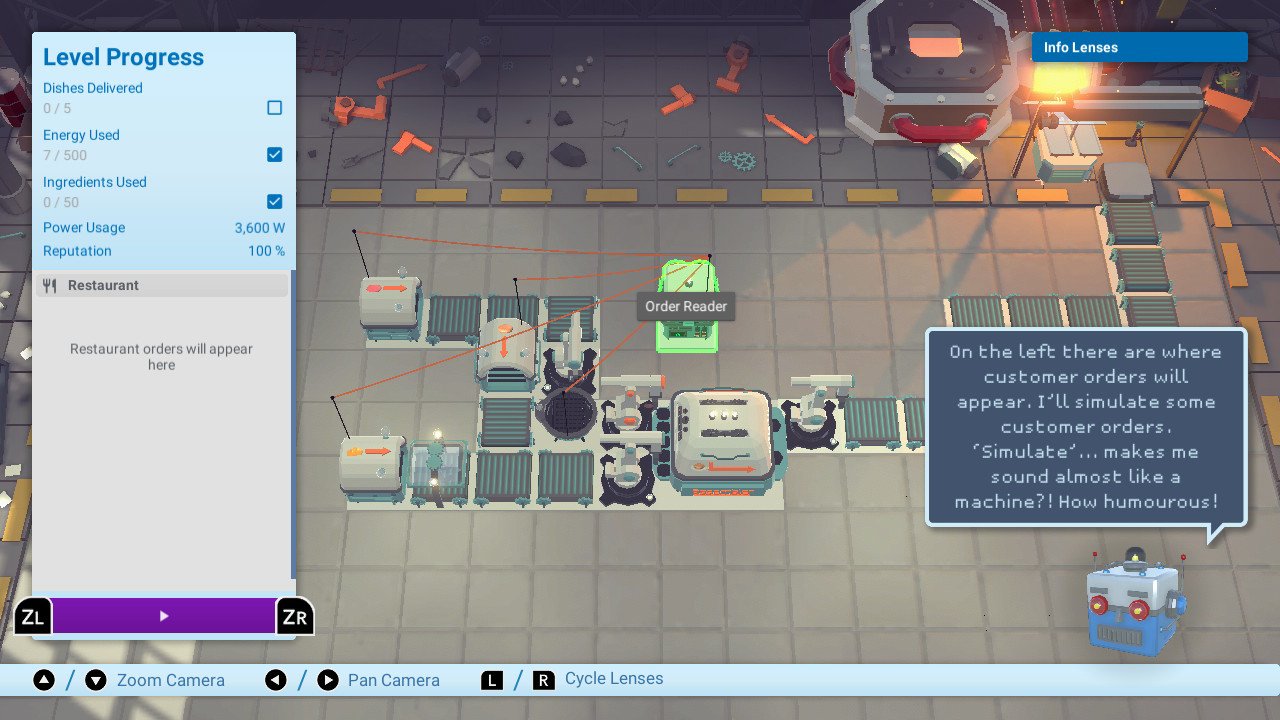 If you just fancy messing around with all of the appliances on offer, without having to worry about serving customers, saving money, and not creating power-hungry production lines, then you can head into the Test Site. In here, you are free to experiment with every recipe, tool and device in the entire game, including those you haven’t yet unlocked like the faster conveyors or teleportation pads! I’ve dabbled with new creations within this mode but the game presumes you have prior knowledge of using the new devices, which I did not. Sure, you get a small paragraph of information about each component when you select it, but it’s not the same as the mini-tutorials you get when you progressively unlock them during normal gameplay.Â