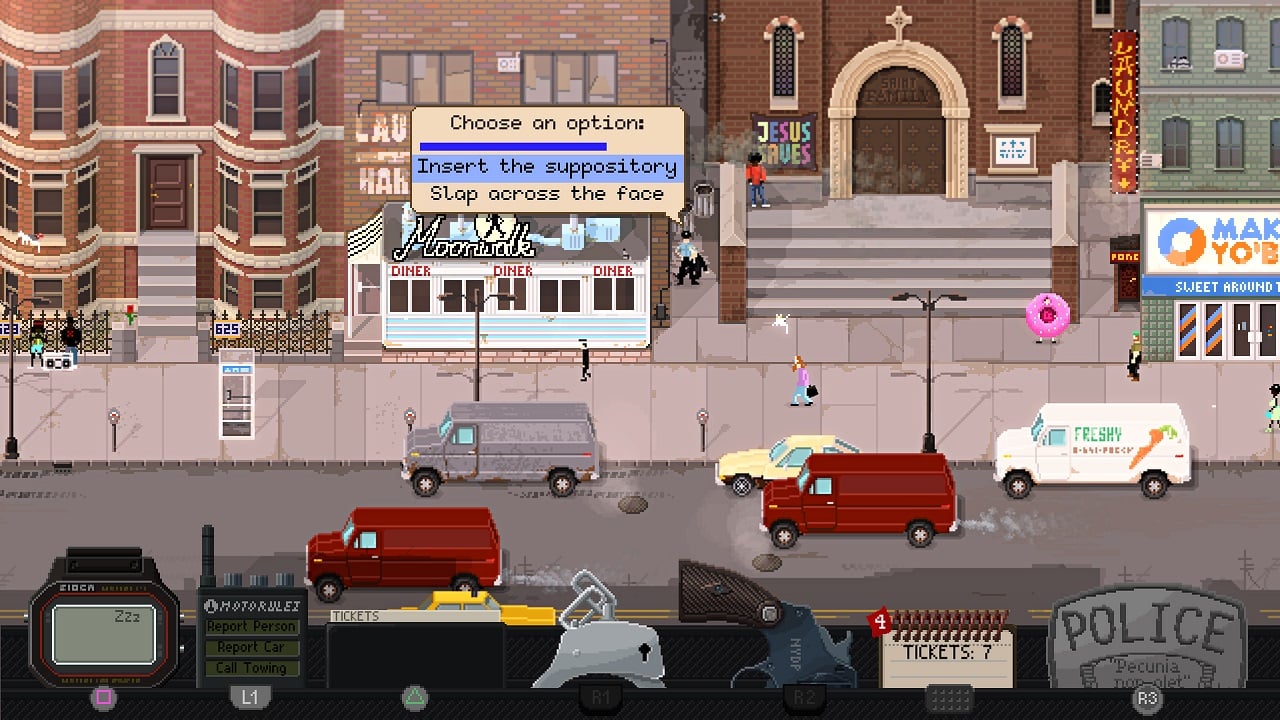 Oh, if you don’t pay your alimony then you get thrown off the force and it’s game over – so it’s kinda important you pay her. Also, if you don’t meet your quota for the day with regards to parking tickets and towing of vehicles, you can also kiss your job goodbye.