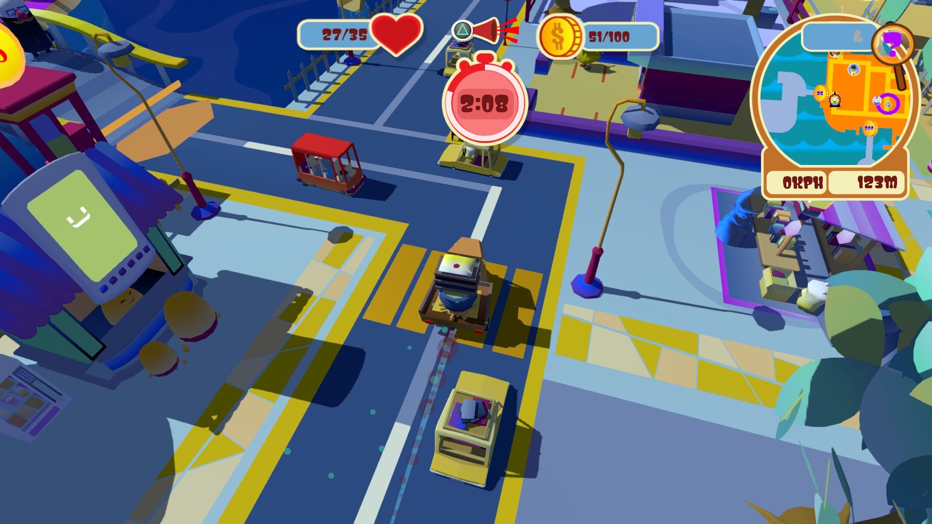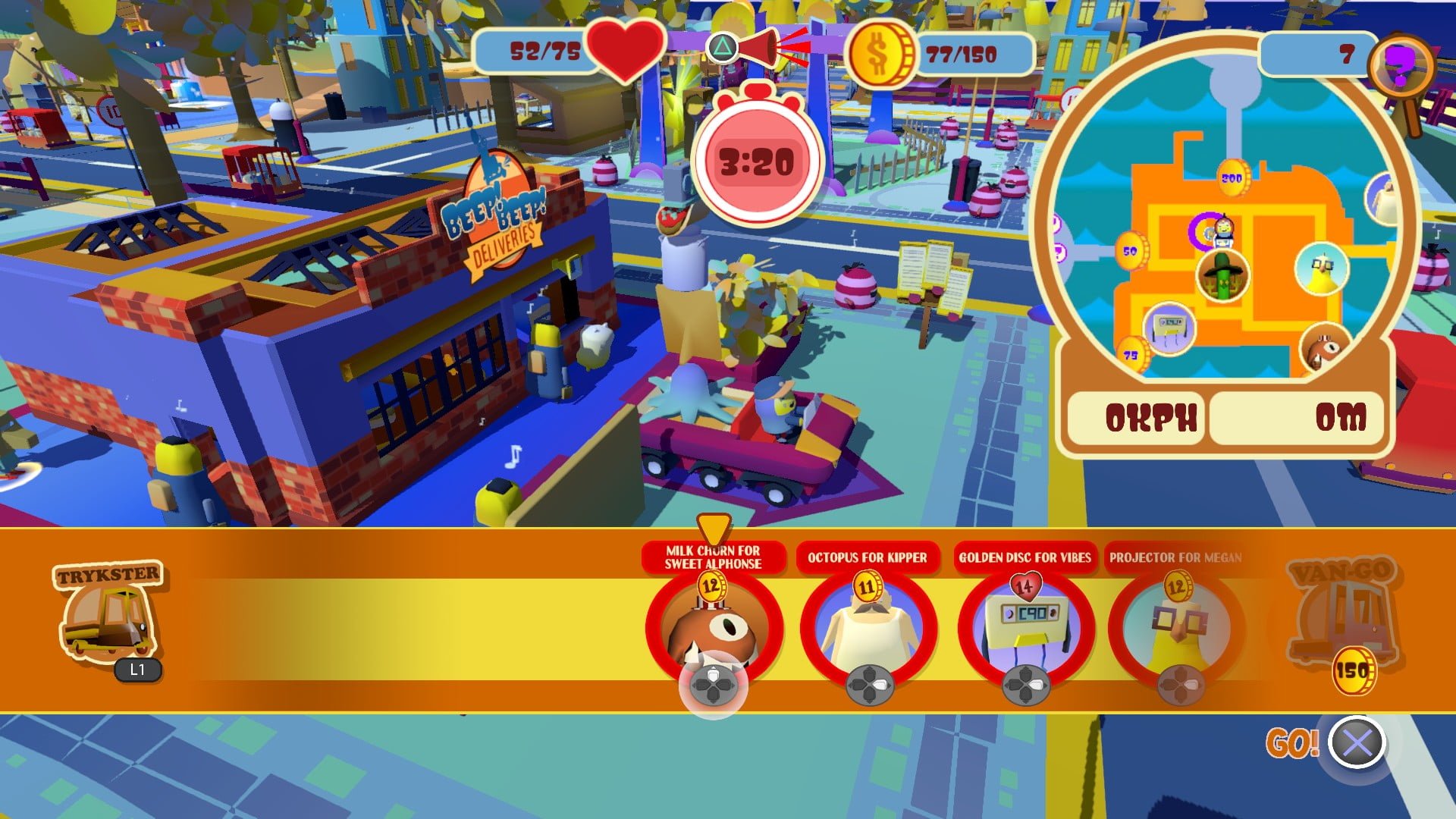 Visually, and even in terms of its music, Beep! Beep! Deliveries reminded me a lot of de Blob and de Blob 2. Everything is low-detailed and very colourful, yet it all looks very sharp and vibrant on the PS4. The music is almost jazz-like at times, bass and percussion-based at others, then spooky when the ghosts come in to steal your parcels at midnight (as there is a day-night cycle). It’s all very cartoony and cute, despite the frustrating gameplay aspect which will have you raging fairly often.