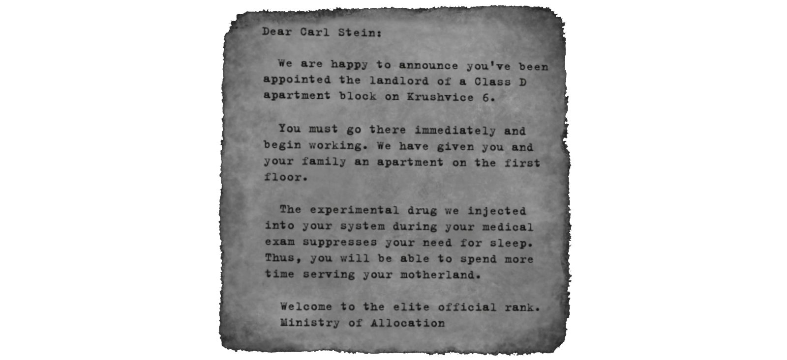 Beholder: Complete Edition begins with our main protagonist, Carl, being assigned the role of Landlord for a small 8-room apartment block which has been taken over and ran by the state. Being Landlord is merely a cover as the government actually placed you there to spy and gather evidence on your tenants as they innocently live out their lives, unaware of your alternative agenda. However, you must also balance the needs of your family and the tenants if you wish to remain trustworthy and loyal in their eyes. As I briefly mentioned above, you can approach many of the situations in various ways as there is usually a ‘good citizen’ route (where you please the state and earn brownie points with them but become less trustworthy with the public) and a ‘morally correct’ route (these will usually please the tenants but the state won’t like it if you come up for review and have let too many people slip by).