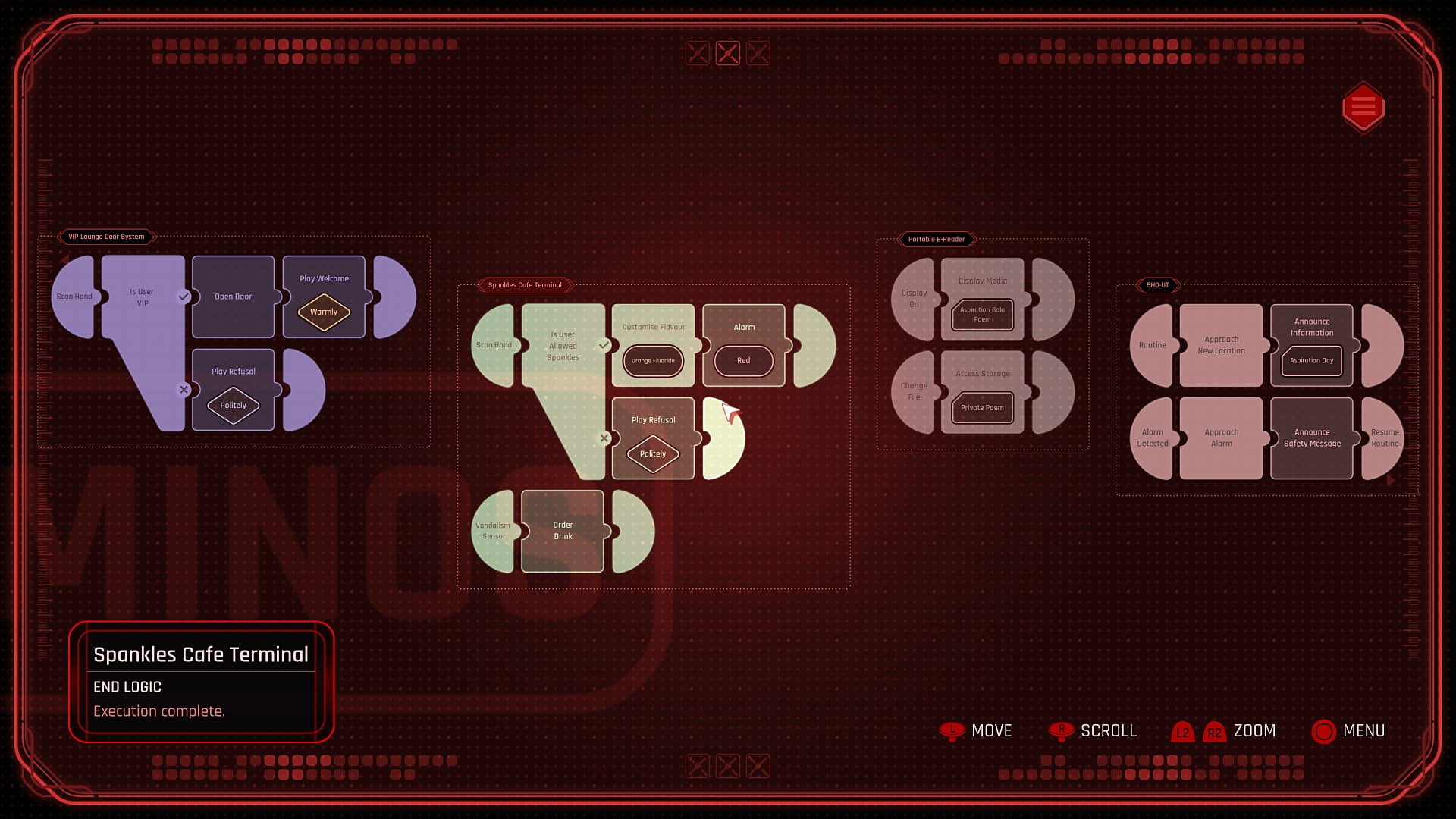 I touched on the hacking mechanic above, but I feel it deserves to be talked about in more detail. I’ve not seen anything quite like this before, especially within a narrative adventure game. Early on, literally within the first act, you get your hands on a MINOS Hacking device – a tool that lets you re-program practically any robotic or mechanical object whether you need to do so for a puzzle or not. This can lead to some rather interesting outcomes as well as even more comedic moments and dialogue.