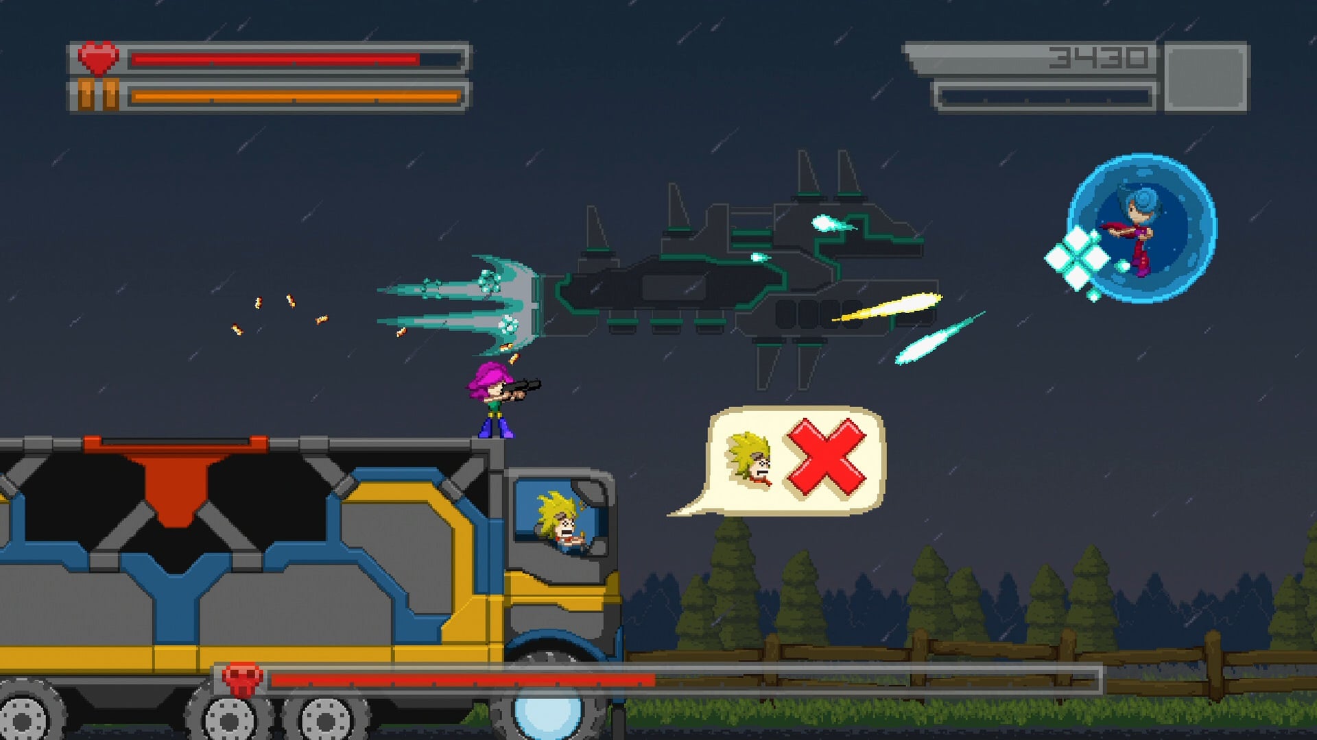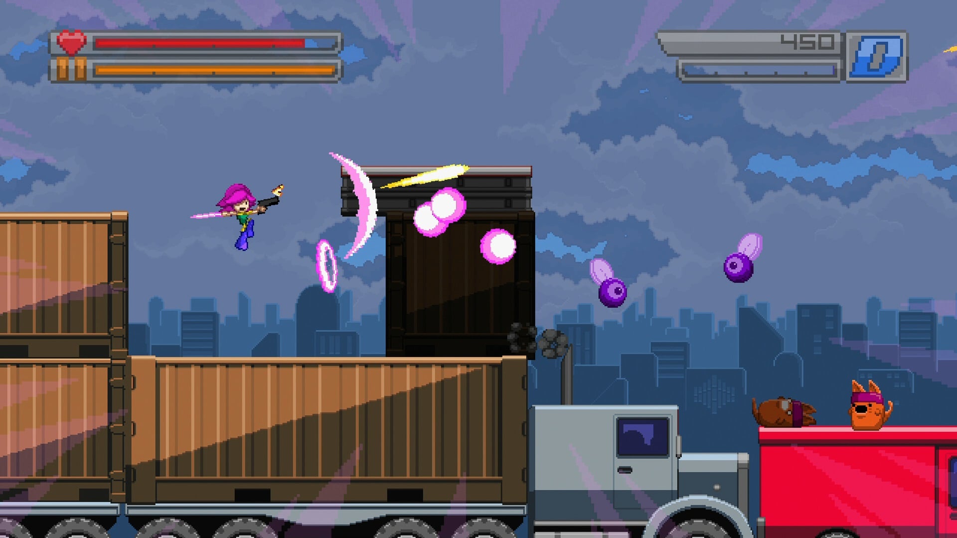 Bleed 2 is such an amazing indie title, it even stands up to some of the bigger companies 2D titles as well! The game has been designed around allowing you to do whatever you need to in order to both achieve a high score and look cool in the process. From jumping off a moving truck to avoid a missile then promptly jumping back up without touching the ground, to slowing down time so you can jump through a tiny gap in the oncoming barrage of projectiles – it’s so sleek and seamless. One thing which really stood out for me is that I never got bored of all the action which was happening on screen. There have been a few other games in the past where I would become bored due to performing the same actions over and over in order to overcome the threats – in Bleed 2 almost every fight requires a different strategy.