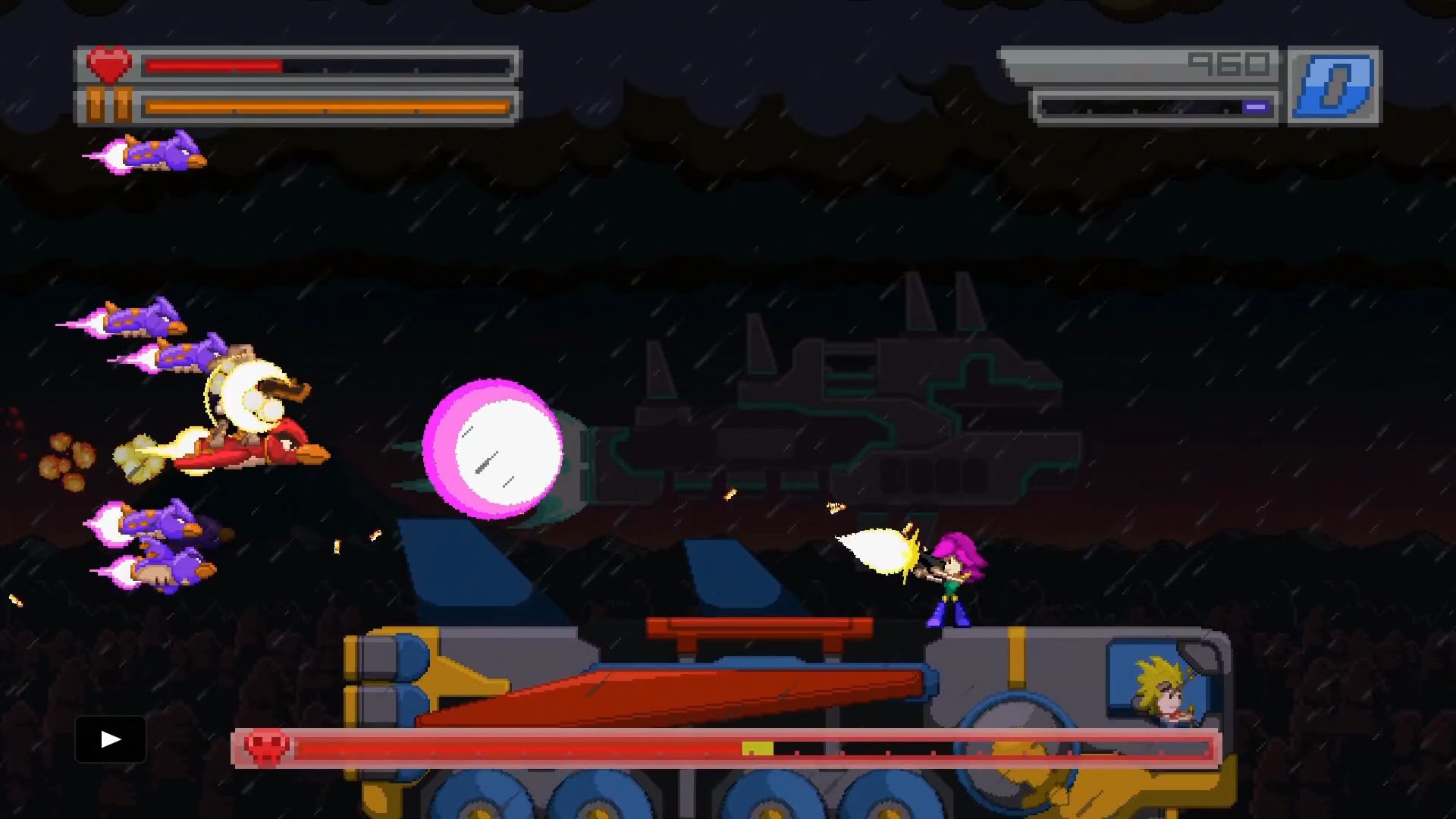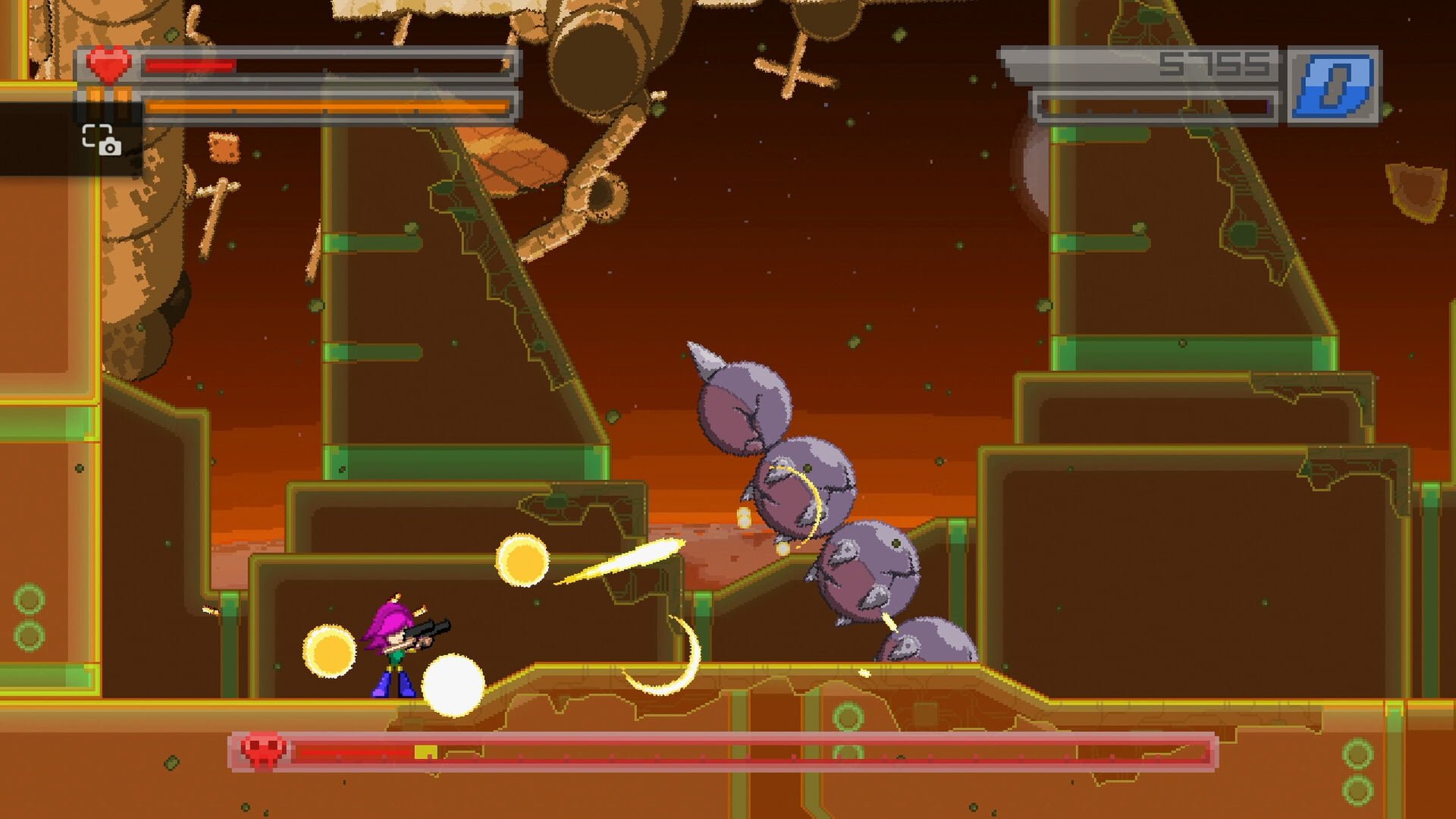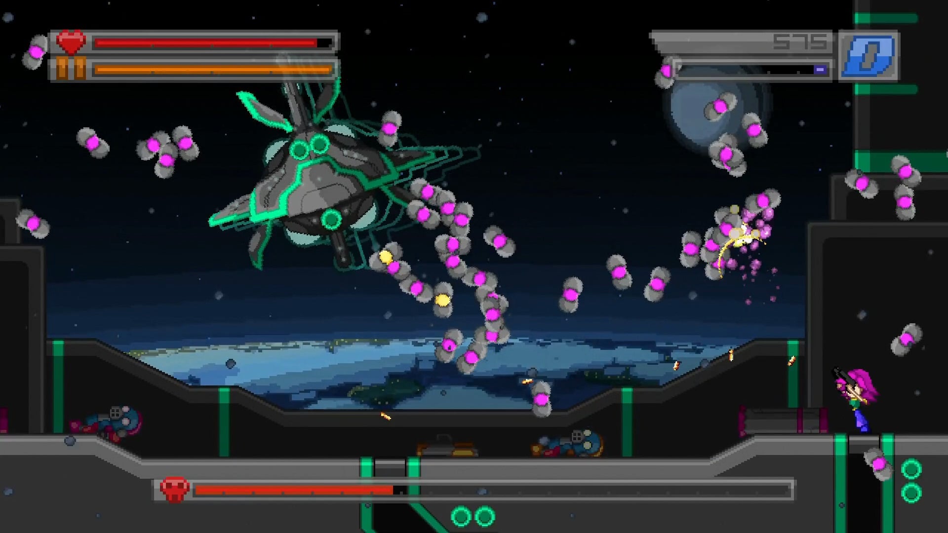 As she runs outside to see what all the fuss is about, everything becomes clear. She sees a mother ship, from an unknown being, pouring its minions into the city. With her trusty double pistols and katana in hand, she smiles as she runs headfirst to take out this new villainous threat – so she can return to playing her video games! You will control Wryn through seven levels of bullet-hell, constant deaths and many, many bosses as you uncover who the new threat is and aim to eliminate them.