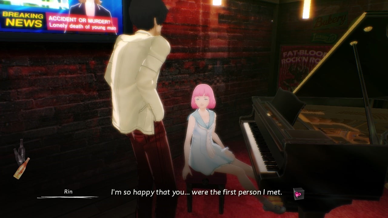 Vincent is unable to fully commit to Katherine and is unsettled by the talk of marriage. As such, he finds himself led astray and ends up drunkenly cheating on Katherine with the provocative blonde bombshell and aptly named ‘Catherine’. Where Catherine: Full Body greatly departs from the original game is by further complicating Vincent’s relationship issues by adding a third love interest, the rather innocent and cute Rin, who begins to work at the Stray Sheep as a piano player and also moves in as Vincent’s next-door neighbour.