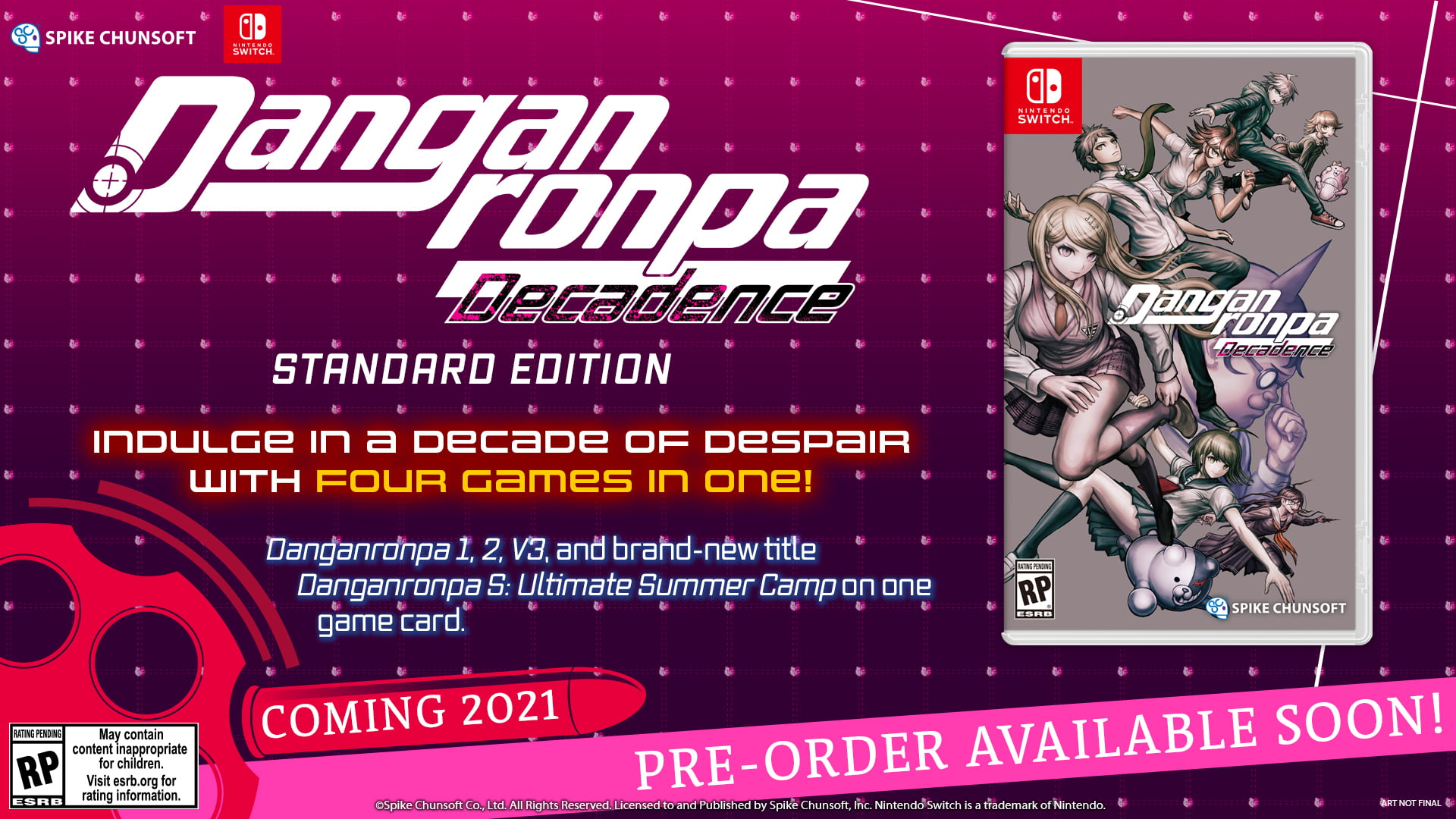 • Danganronpa Decadence – Danganronpa 1, 2, V3, and brand-new title Danganronpa S: Ultimate Summer Camp on one game card.