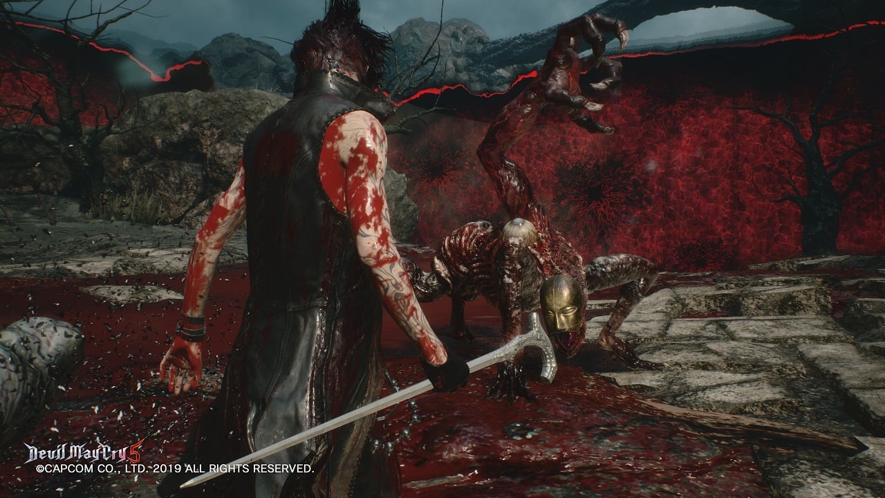 V is the gothic newbie to the franchise, having appeared in nothing at all before Devil May Cry 5. As I mentioned before, instead of just sitting on the bench, V will get his hands dirty and help you fight off the demons, even if he hobbles around with a walking stick. This is V’s only physical attack – he smacks things to death with his walking stick!