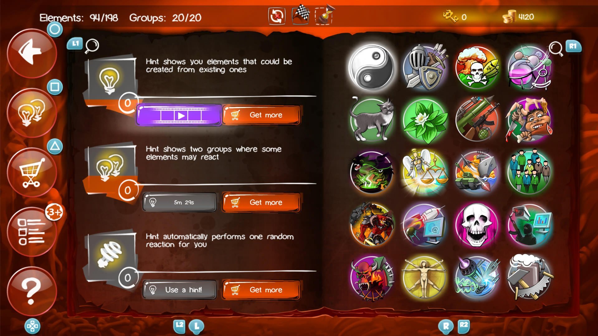 In terms of hints, you can buy packs of tokens that will either show you something you can create (leaving the discovery of what to use for you to figure out), show you two elemental groups which can be combined to make a new element (but not which elements within the groups it’s referring to), or simply an option for the game to automatically mix two elements and create a new one which you don’t have (meaning you don’t have to do anything). Each of these increase in price, with the middle one giving you a free token every ten minutes or so.