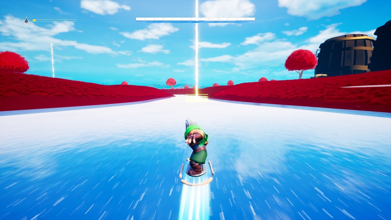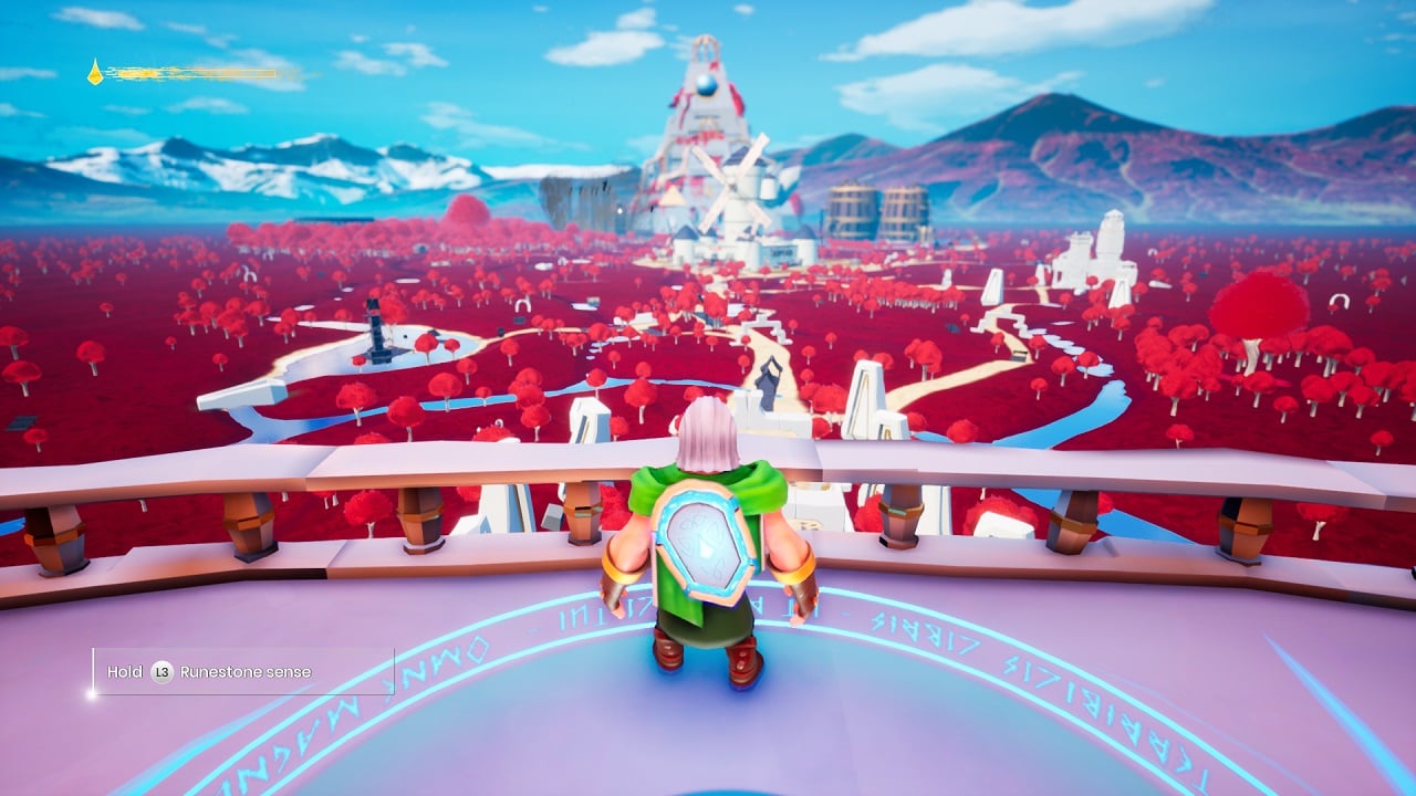 Okay, the world of Effie isn’t a full open-world, as there is an invisible border, but the size we have to wander around is decent. Thankfully, you’re not expected to walk around as you uncover the secret locations and move from town to town, you have your Hoverboard! Well, it’s a Hover-Shield, but still – it’s cool! The world itself consists of bright red vegetation which not only looks absolutely beautiful, but it also provides a perfect contrast to the green scarf our protagonist wears. Not only that, the blue waters, the purple grape lakes and the cream-coloured roads, all look absolutely divine as you’re zooming around at incredible speeds upon your shield.Â