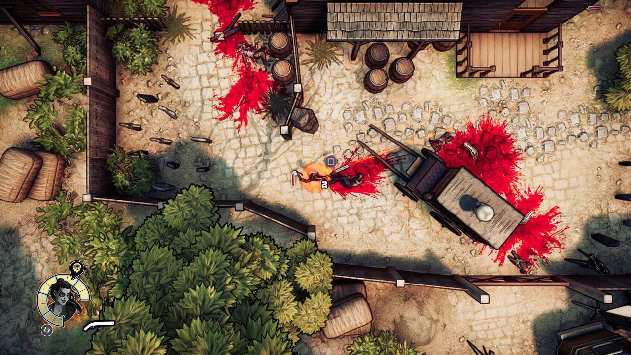 God’s Trigger runs like a dream. I didn’t notice any frame dips or adjustments in quality when the screen was painted red with the blood of my enemies splashing all over the place. In a game like this, the game has to allow you full control with split-second reflexes and precision, something I feel the developers pulled off perfectly. Visually, the game looks beautiful, in a sadistic way. The characters are almost Borderlands-like as they are drawn with thick-outlines and bold colours, each one with their own original look and attacks.Â