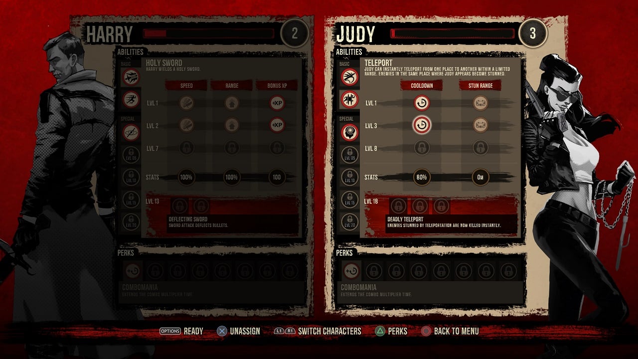 In order to make the game stand out from the crowd and bring your attention to it, the game has a rather unique feature – local co-op for one or two players. If you’re playing on your own then you press Circle to swap between who you’re playing as, as you need to use the special abilities of both protagonists throughout the levels in order to trigger switches, grab chests, or get behind the enemies. What I found interesting was the distribution of experience. You only get experience if you made the kill. So, if you play a level and only play as Judy, Harry won’t level up anywhere near as fast. It’s a nice way of forcing you to play as the other character as I personally loved playing as Judy and didn’t really like Harry, but I knew I had to alternate in order to keep it fair. Let’s take a look at the characters in more detail…