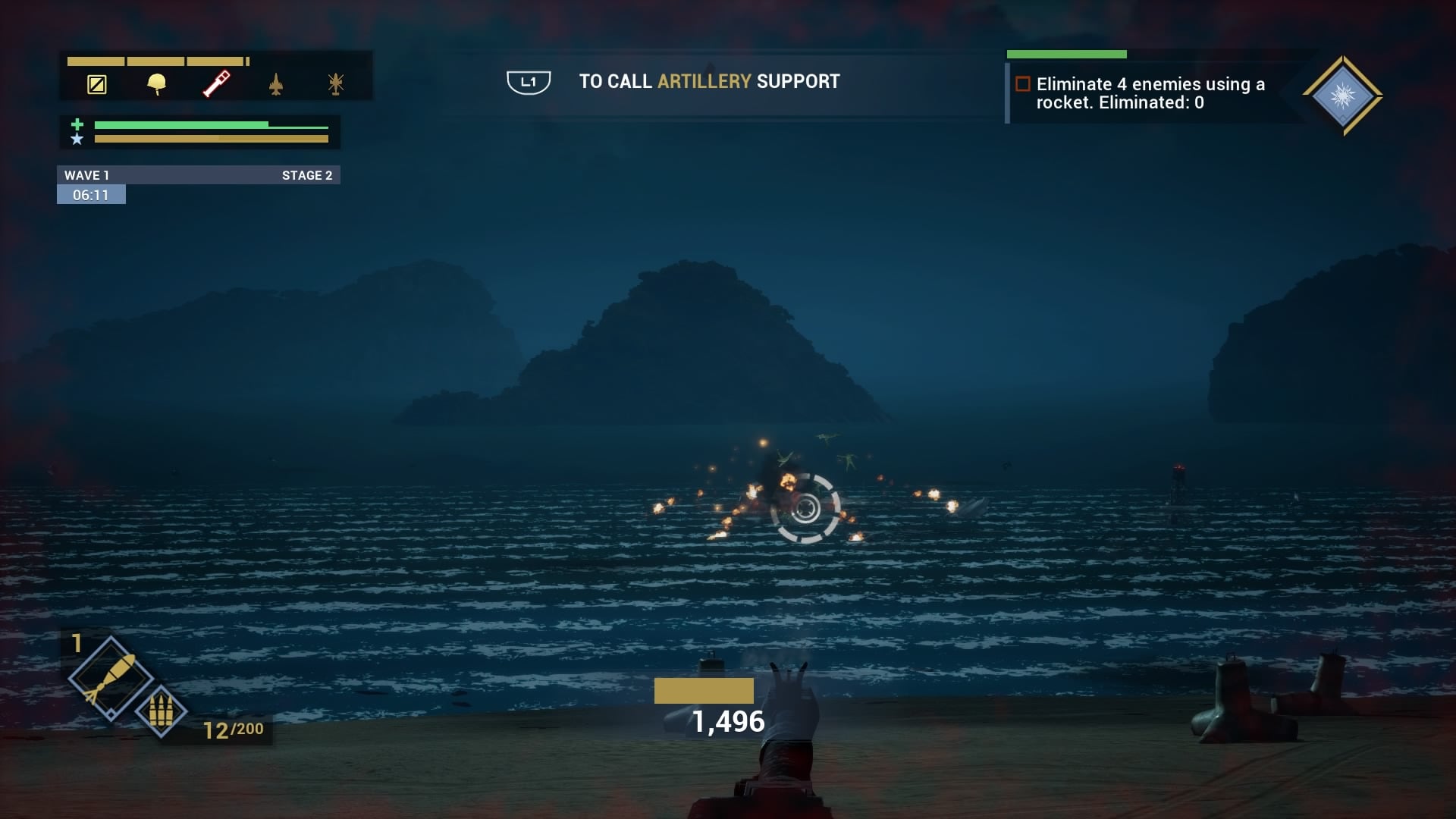 There are a total of 4 stages to work your way through. Each one has day and nighttime sections that follow on from one other, each with different stage designs. First up was a beach, then shipyard, airport, and finally a city pier. All the levels are about 20 minutes long, give or take, with no difficulty adjustments. Thankfully, with the skills purchased and the call in support, none proved too difficult.