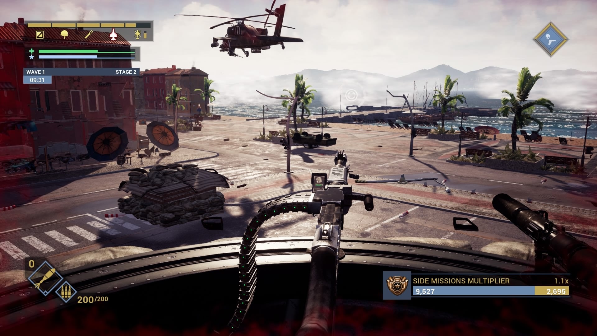 As previously stated, the gameplay has you at the trigger of a heavy machine gun, equipped with a rocket launcher on the side. You remain stationary within one spot whilst providing defence against waves of enemy soldiers trying to take you down. Taking too much damage causes you to die, clearly, but the game allows you to carry on playing from the point of death with all the perks you’ve previously unlocked.
