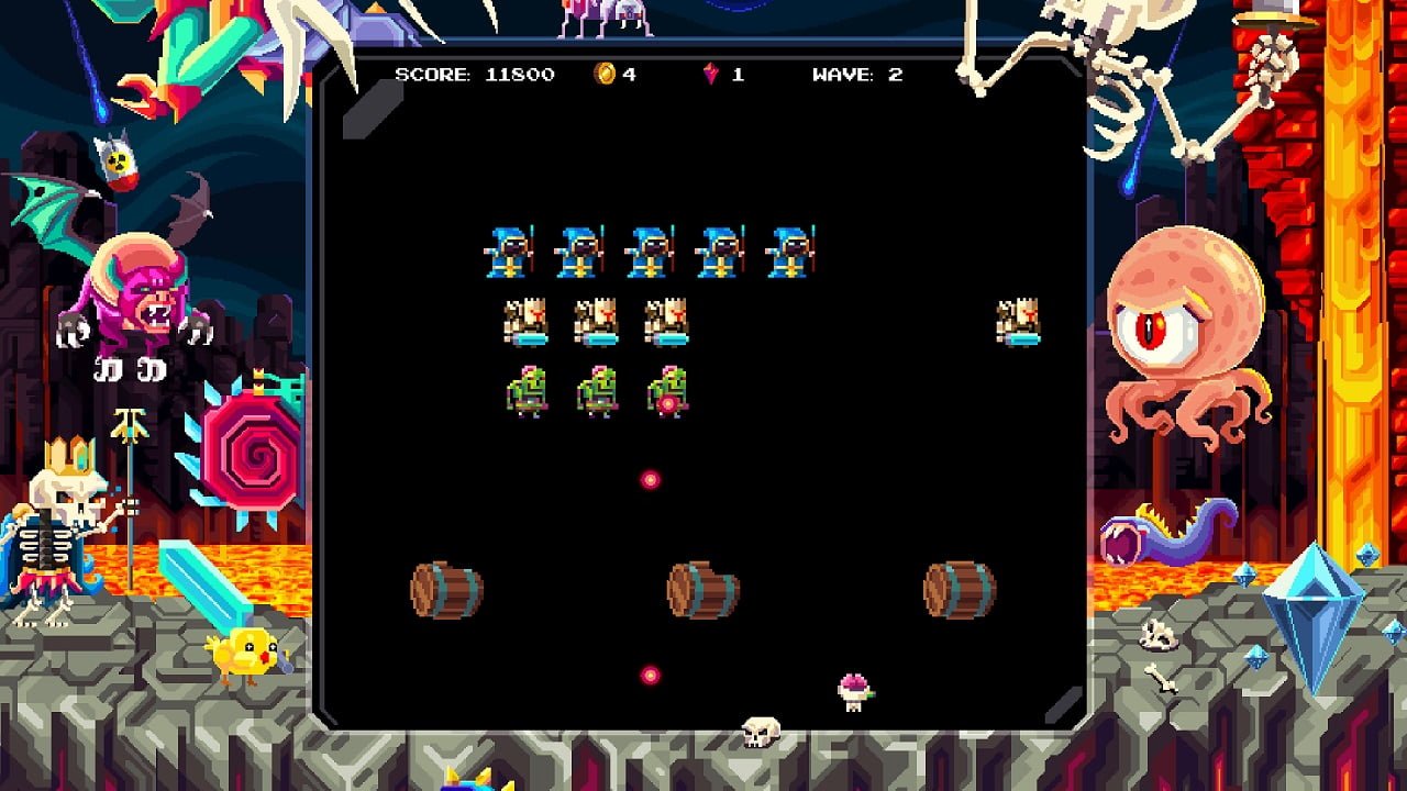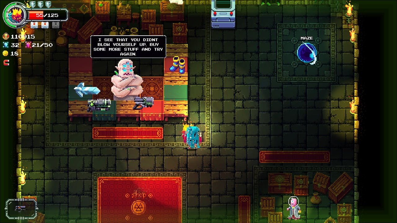 As well as the normal mode, there are two other modes you can opt to play. These are tournament mode and a local co-op mode called gauntlet. There’s even a little arcade machine in the shop where you play a Hellmut style version of Space Invaders which can earn you some coins, so long as you have coins to play in the first place. It’s a novel and mostly pointless feature but one I admittedly spent a fair bit of time on, it’s just something about Space Invaders that means you have to play it.