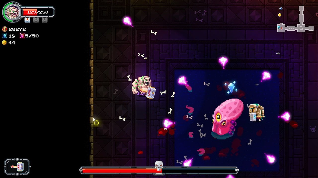 Whether it’s some kind of weird issue in me I’m not sure but I particularly enjoy the option to leave the gore on the screen. You can choose to keep all of the bones and blood from enemies you’ve slaughtered to remain on-screen which adds pleasingly violent images to your playthrough. It’s satisfying to see all of the remains on the floor from all of your crazy fights just to see just how much carnage you’ve caused. It’s not an eyesore either, as there is never so much that the screen becomes cluttered and therefore hard to explore.