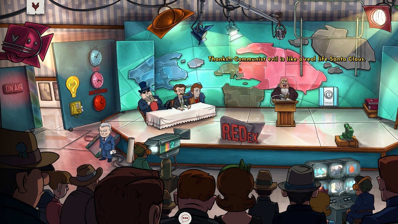 Irony Curtain: From Matryoshka with Love is a satirical comedy which is filled to the brim with puns, references, parodies, and humour which will have you laughing out loud throughout the very long narrative. Graphically the game looks amazing, from the highly detailed backdrops to the unique individuals you’ll meet along the way, every scene is a delight to experience. Coupled with an amazing soundtrack and an awesome cast of voice artists, the game comes alive with every interaction you have either with an NPC or an object you click on. Some of the puzzles can be quite cryptic and require a bit of thought, but the in-game hint line will always push you in the right direction without blatantly telling you what to do – thus making the satisfaction for passing a chapter remain even if you opt to use the hints.Â