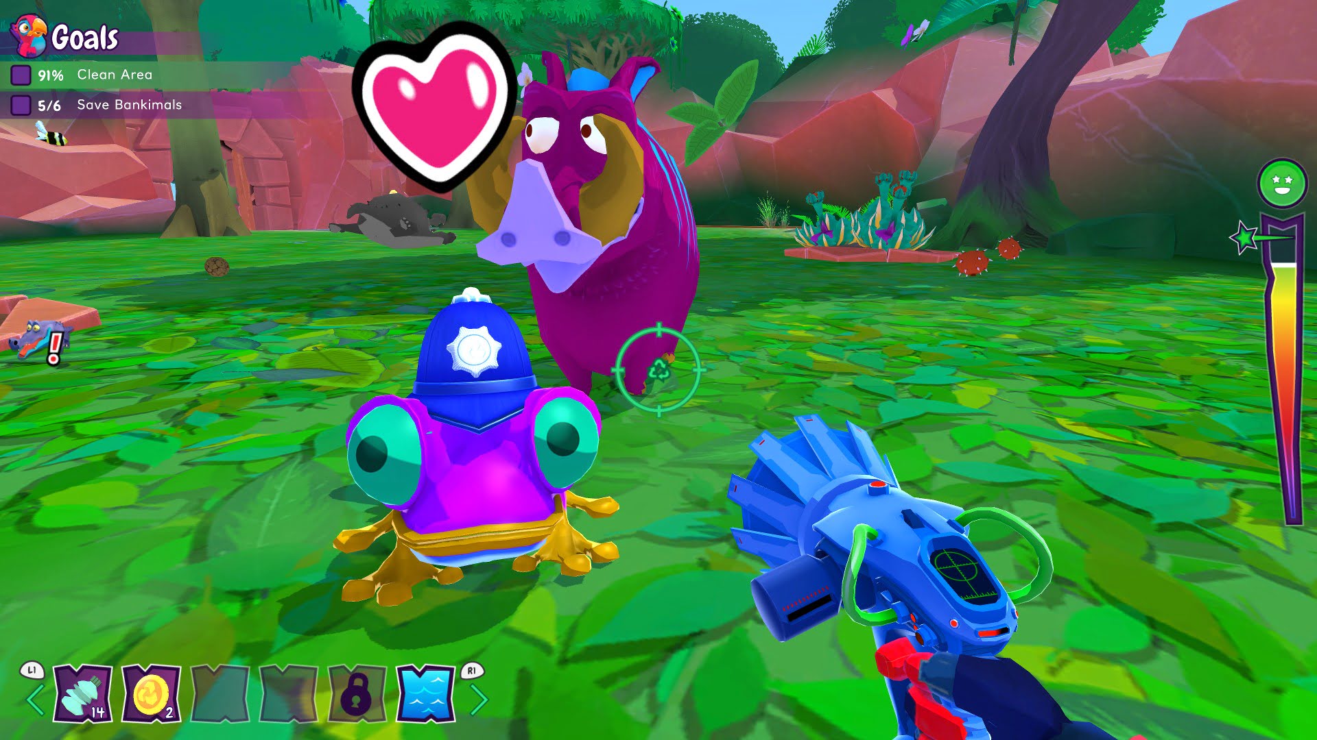 Not only are you washing the gloop off the land and throwing the trash into the recycle bins, but you’ll also be using the trash to create various structures as you move to the later islands in order to encourage children to do the same. One thing which I found quite surprising is that the Bankimals, who will casually eat their favourite food and get on with their life if you’re ignoring them, will actually try and eat the rubbish if you’ve not tidied it up. This results in them ‘getting their slot blocked with trash’, requiring you to suck the rubbish out of them so they can breath/survive.Â