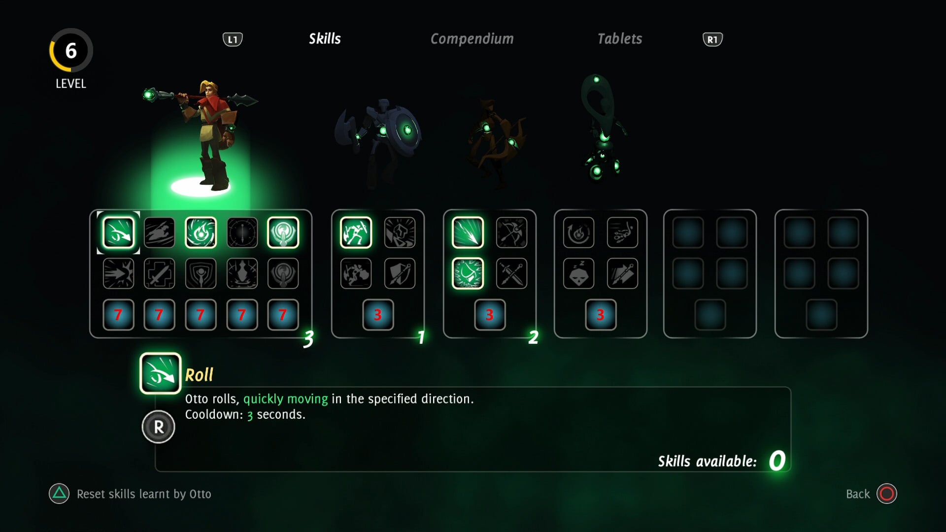 As I mentioned above, Masters of Anima also has some RPG elements within it, the ability to increase your guardians and our protagonist skills in order to make things easier. As above, you can see an image of the skill tree early on in the game, there are five different types of guardian to unlock, each with its own tree with certain skills blocked off until you unlock a certain number of skills above it. You don’t unlock skill points very quickly and when you do you must pick which item you wish to unlock as you don’t get a certain number per thing. So, one skill point will let you unlock one thing in any of the six trees, you don’t get one for Otto, one for the first guardian, one of the second…