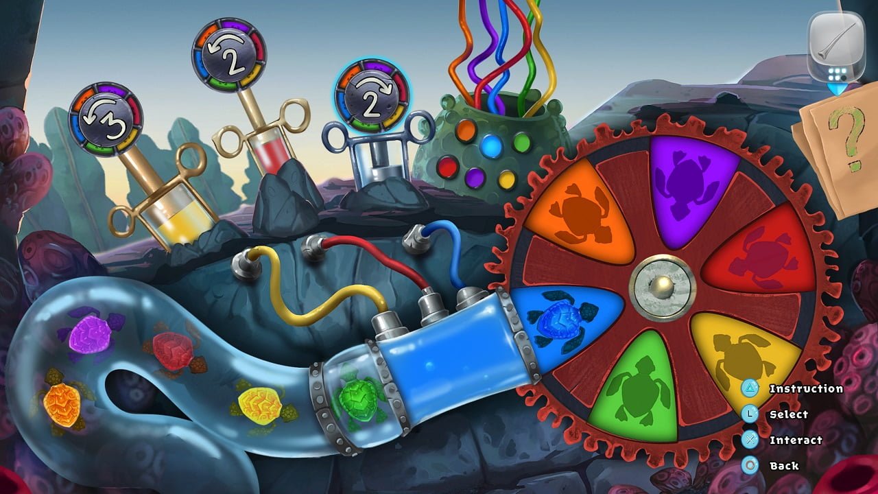 As the entire game is basically an expanded hide-and-seek game, there are a few mechanics which help you out as you traverse through this delightful game. Whilst navigating around the various screens (using the D-pad or clicking the sides of the screen), you’ll see various doors, items, locks, etc… which have a small white butterfly upon them. Clicking these will begin a ‘fetch quest’ in the top right-hand corner of the screen. For example, the first one you’ll see is your ladder out of your Rabbit Hole. The ladder is half completed and you can’t get out – thus the quest to find some new rungs for the ladder begins. An icon remains in the top right which you can obtain info on by holding R2 – this shows you what the pieces are used on, in case you forget.