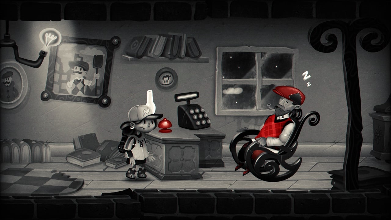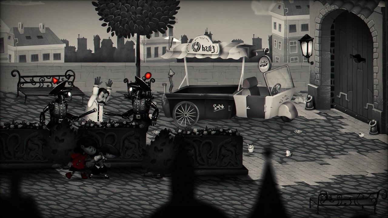 As mentioned above, My Memory of Us is a fantastical journey through the story of an old man, which is superbly voiced by Sir. Patrick Stewart. We begin the game as a young girl who strolls into this man’s bookstore and uncovers an old, dusty book which was full of pictures of a girl who looks a lot like us. The man proceeds to tell us of his childhood and his long-lost friend who he met by sheer chance one day. Their adventures, helping out people in need, fending off robot invaders, taking down giant machinery, and helping reunite loved ones, are all set in a beautifully artistic ‘Sin City’ visual design with bold red on black and white.