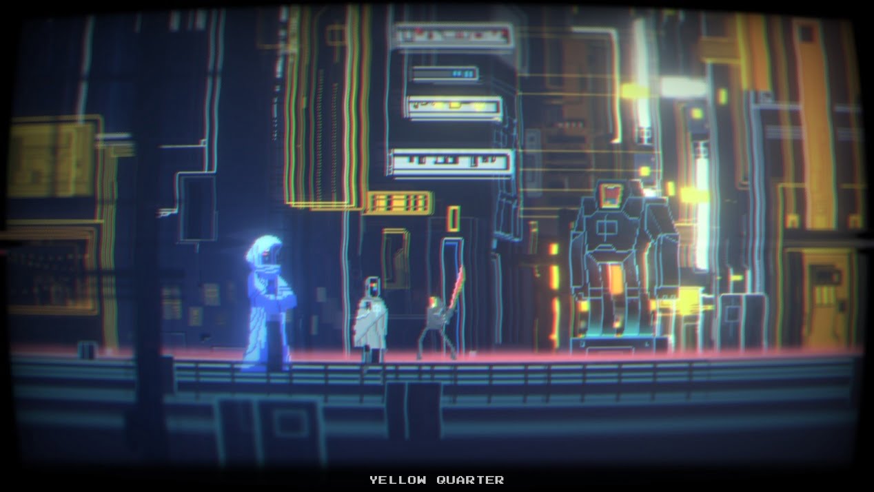In motion, Narita Boy looks even slicker with beautifully fluid attack animations including whist using the Techno Sword you are treated with a stream of red, blue and yellow after-effects that matches the three beams of code from the Houses of the Trichroma.