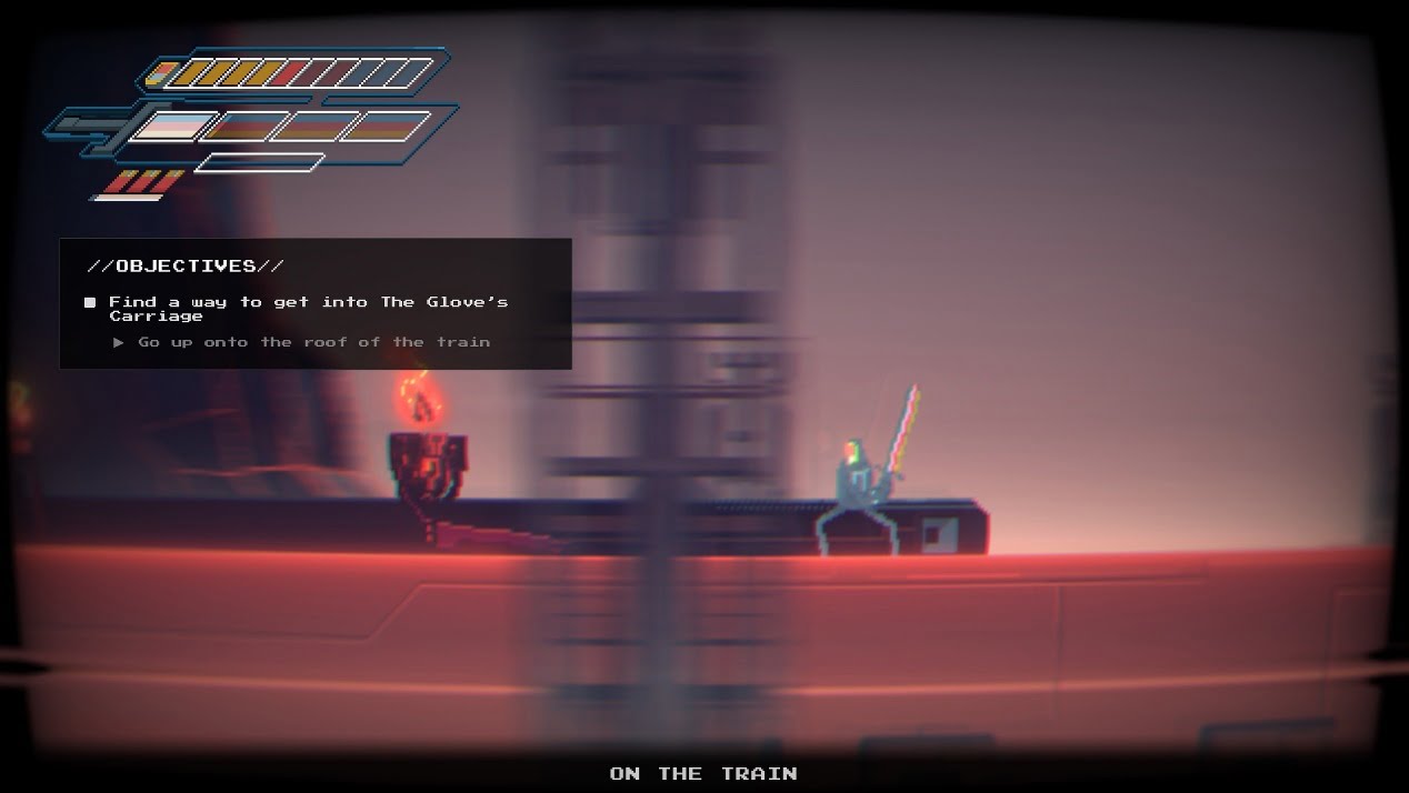 I found Narita Boy to have just the right level of challenge and I was only frustrated during one combat sequence which took place on top of a moving train. This was due to an enemy appearing that was heavily armoured with a huge shield that if you tried to jump over him, he would block you and then hit you with his giant sword. This enemy appeared after quite a few sequences with enemies already, and so you have had to manage your health well up to this point. The armoured enemy is also joined by a couple of other enemies, either side of him, which shoots bolts at you and adds even more attacks to have to avoid.