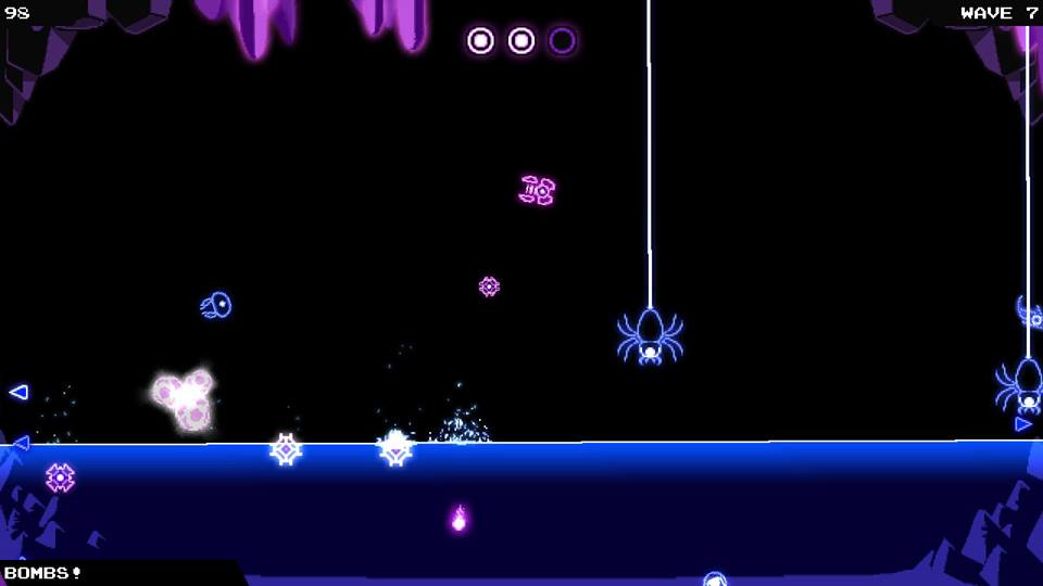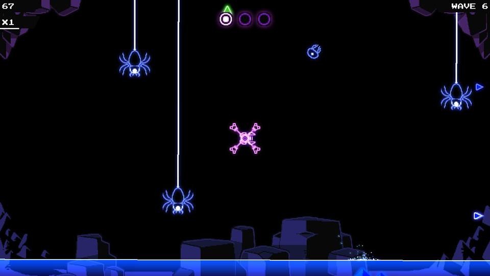Neon Caves is very colourful and has a retro pixel art style that is both nostalgic and modern. The backdrop is a little empty and therefore uninteresting, but it is supposed to be a cave so there’s not going to be a fat lot to look at. The water that floods the cave looks menacing and deep enough to make you feel uncomfortable so I’m guessing it has the desired effect. The enemies range from looking like real creatures (jellyfish, spiders and crabs, oh my!) to strange swirly objects or debris falling from the cave ceiling, all of which stand out thanks to the bold and bright colours. Despite looking simple, it’s also very attractive for the eyes and makes playing it feel very enticing, just like an old arcade machine.