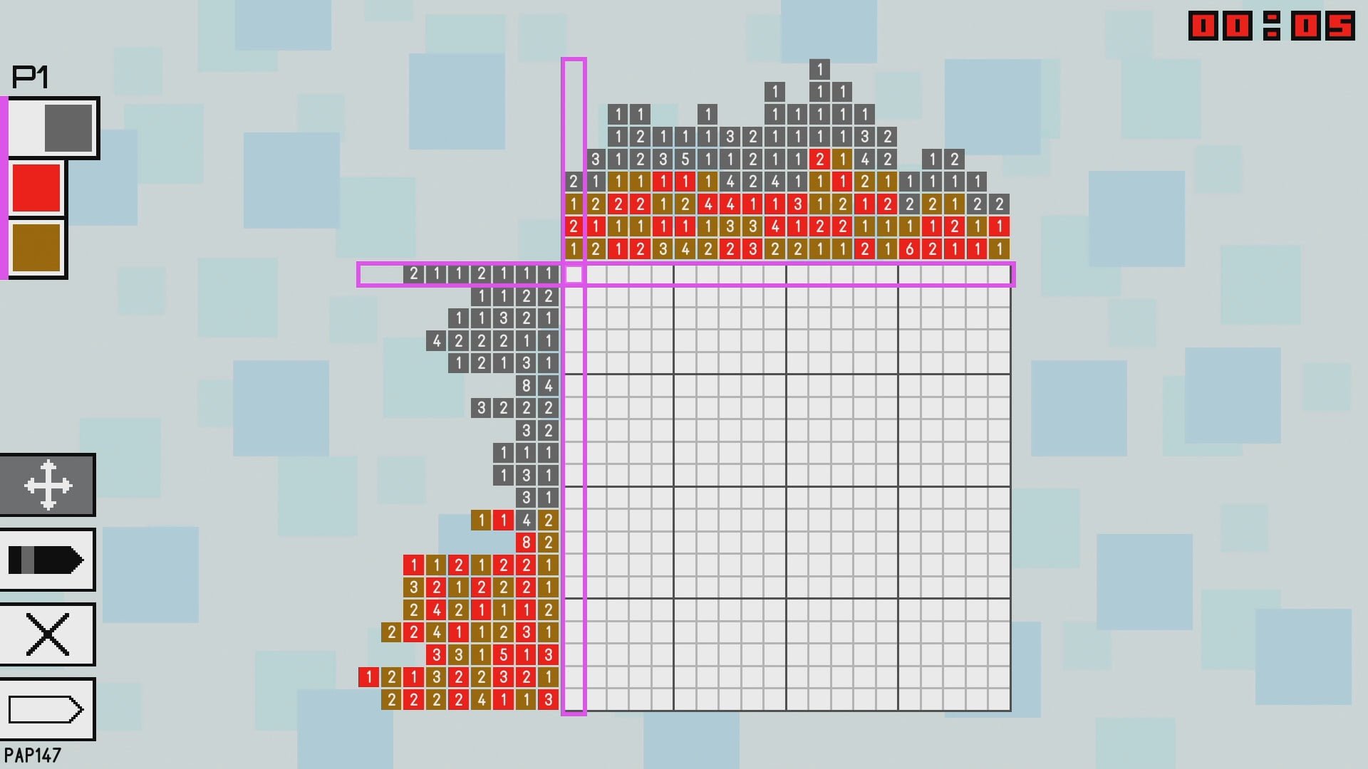 Let’s take a look at the most common version of Picross, the monochrome one. In these you have a grid, let’s say a 5×5 grid, of squares. On the X and Y-axis of the grid, you will see numbers, these indicate how many squares in that row or column are ‘coloured in’. So, if you have a row of five squares and there is a number ‘4’ on the side then you know four of the five will be ‘coloured in’. In this instance, you can colour in the middle three as you know that either way, those three will definitely be part of the solution. You’re best working through all the easy and obvious parts, like that one, first, and then going back on yourself to work out the rest.