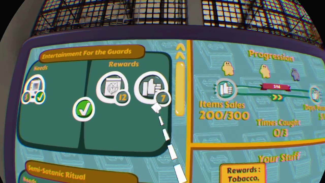 Prison Boss VR is a game about being stealthy as you meet the demand of your fellow inmates. The game has two stages, night and day – you can only craft new products at night time and you can only sell them during the day. This leads to you having to manage your time, space, hiding areas, and efficiency. Let’s talk about the daytime first…