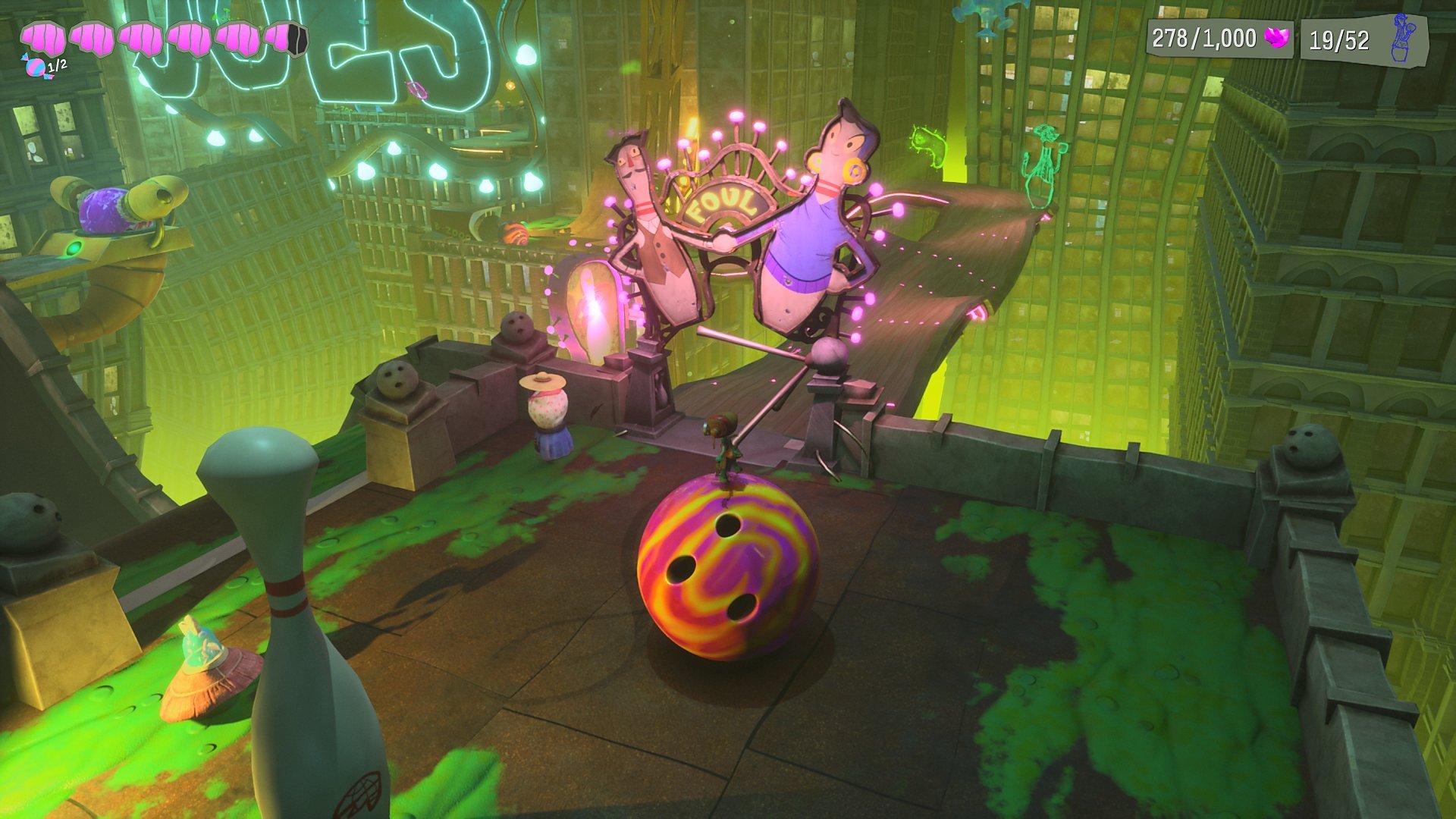 Psychonauts 2’s levels not only take place in the minds of others as there are also a few hub worlds to explore that feature some side quests to partake in and plenty of collectables to find. However, the best creativity and art design are within the games numerous mind delving levels. For example, one has you riding on a bowling ball, having to traverse narrow ledges and unlock platforms shaped as bowling alleys, and another is a fun and frantic gameshow that has you making meals using different foods that require a specific cooking utensil to prepare it.