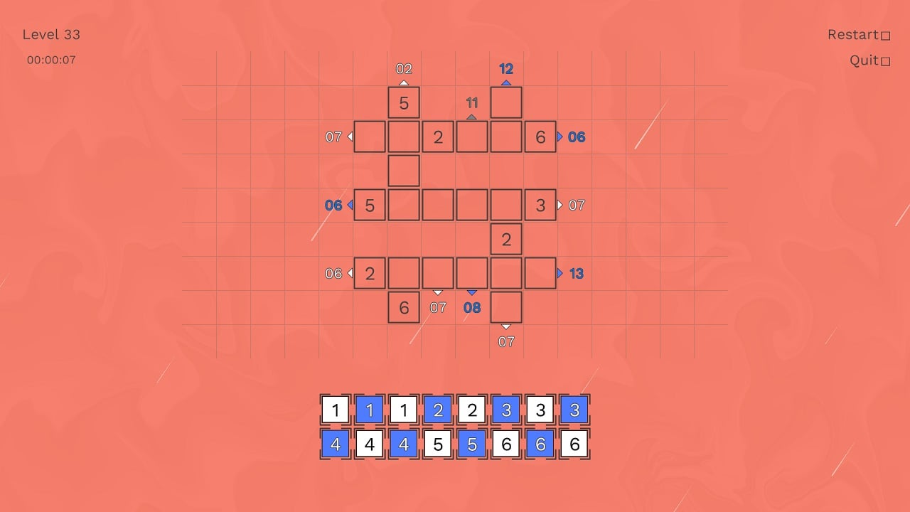 The game starts off nice and easy and then slowly begins to become harder as more mechanics and ‘values’ are given. It does ease you in gently though, with a tutorial for each new type of puzzle as well as a few easy ones before they start getting more and more tricky. The later levels are sure to test anyone’s brain as you have multiple segments with values attached to them, which you can’t go over or under on. Seriously, if you like puzzle games and think Sudoku is too easy, you need to try this out and see how you get on.