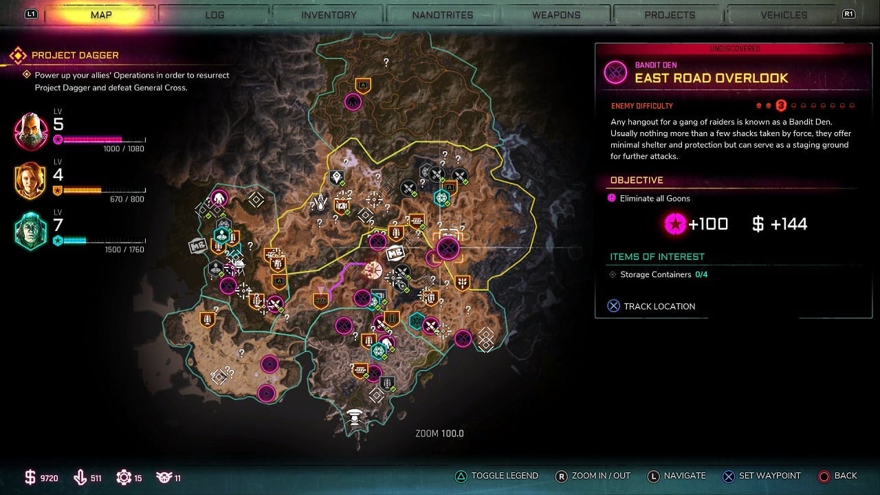 As I previously mentioned, the mini-plane would be great, but it doesn’t work so I’m going to ignore that, so moving on foot or with wheels takes a very long time. A fast travel option to warp to various points on the map, like the four main towns, would be a welcomed addition, but there isn’t an option to do that. Also, I mentioned above about flicking back and forth with the map – as far as I could see, there’s no mini-map in RAGE 2. You can go to the map and set a waypoint, this will put neon pink guidelines on the road (until it decides to turn them off without reason), as well as look at the top of the screen for a compass – but there’s no actual minimap, so I got lost a few times.Â