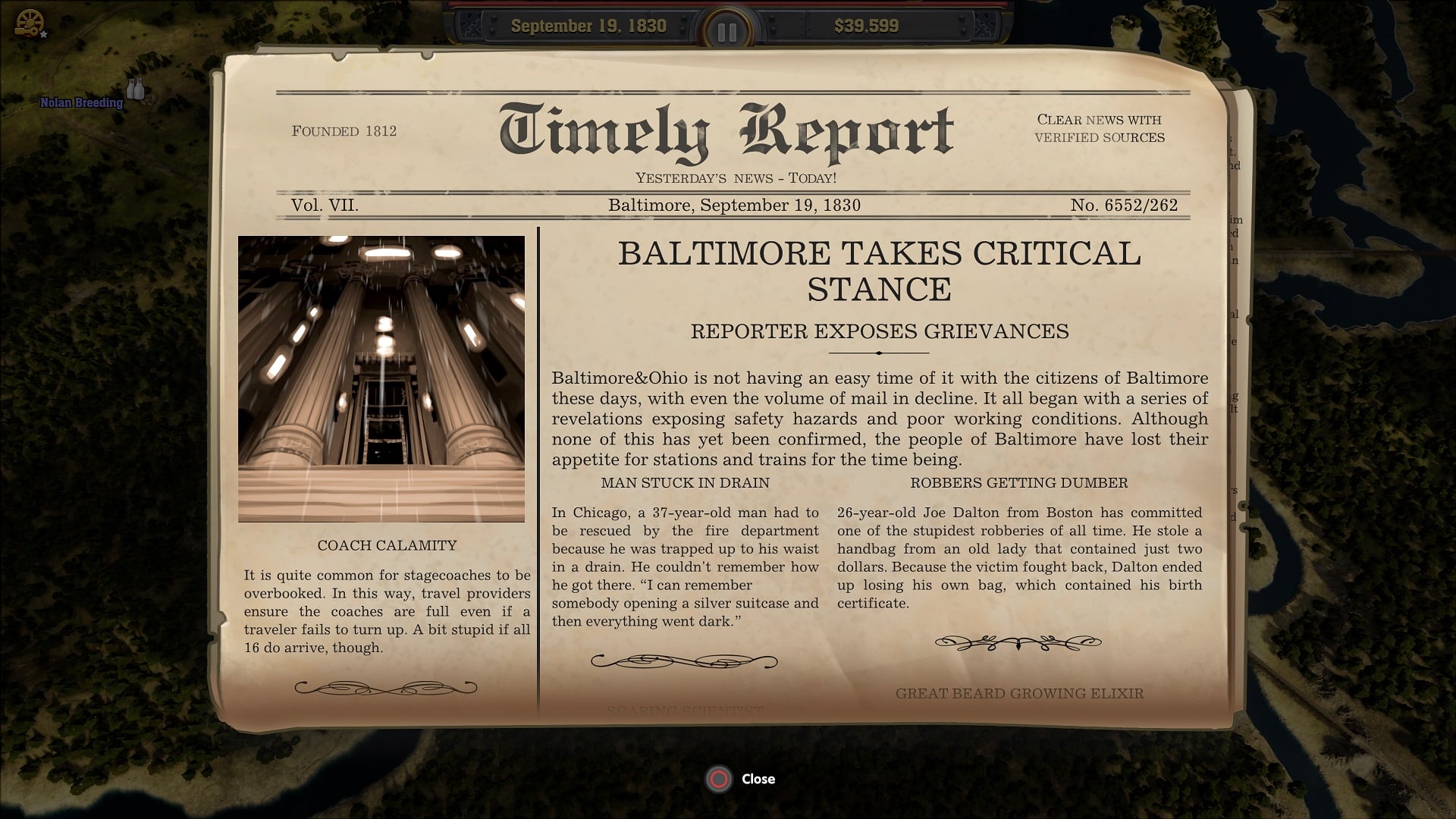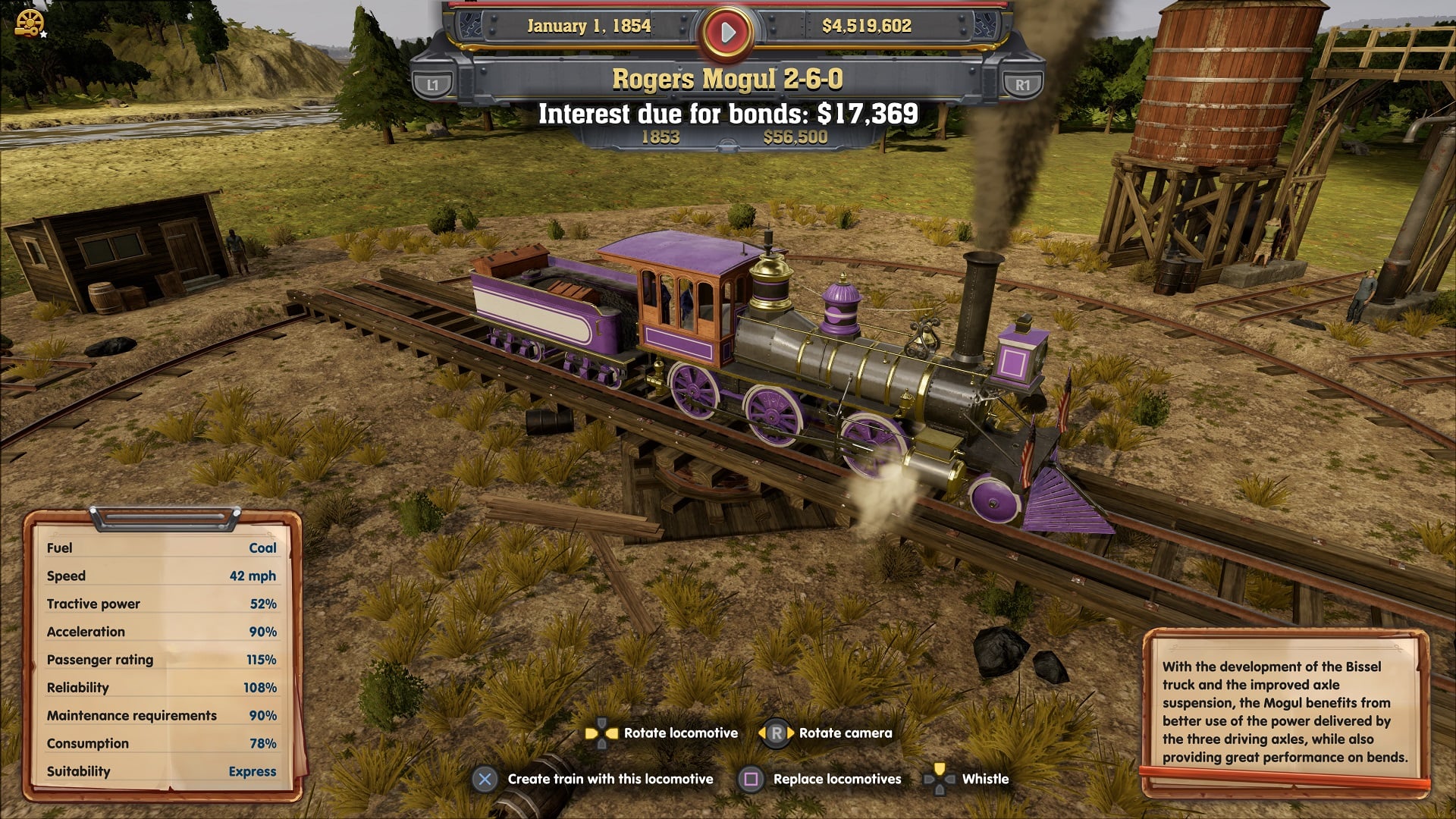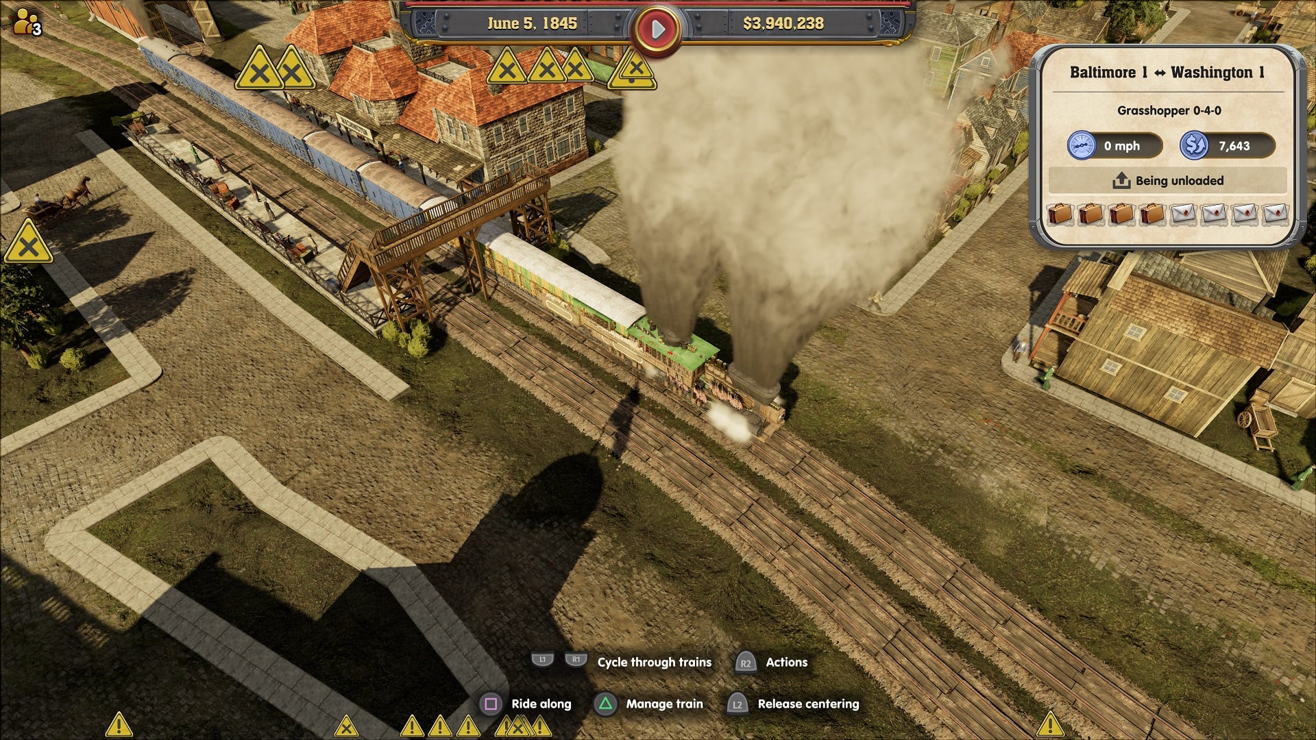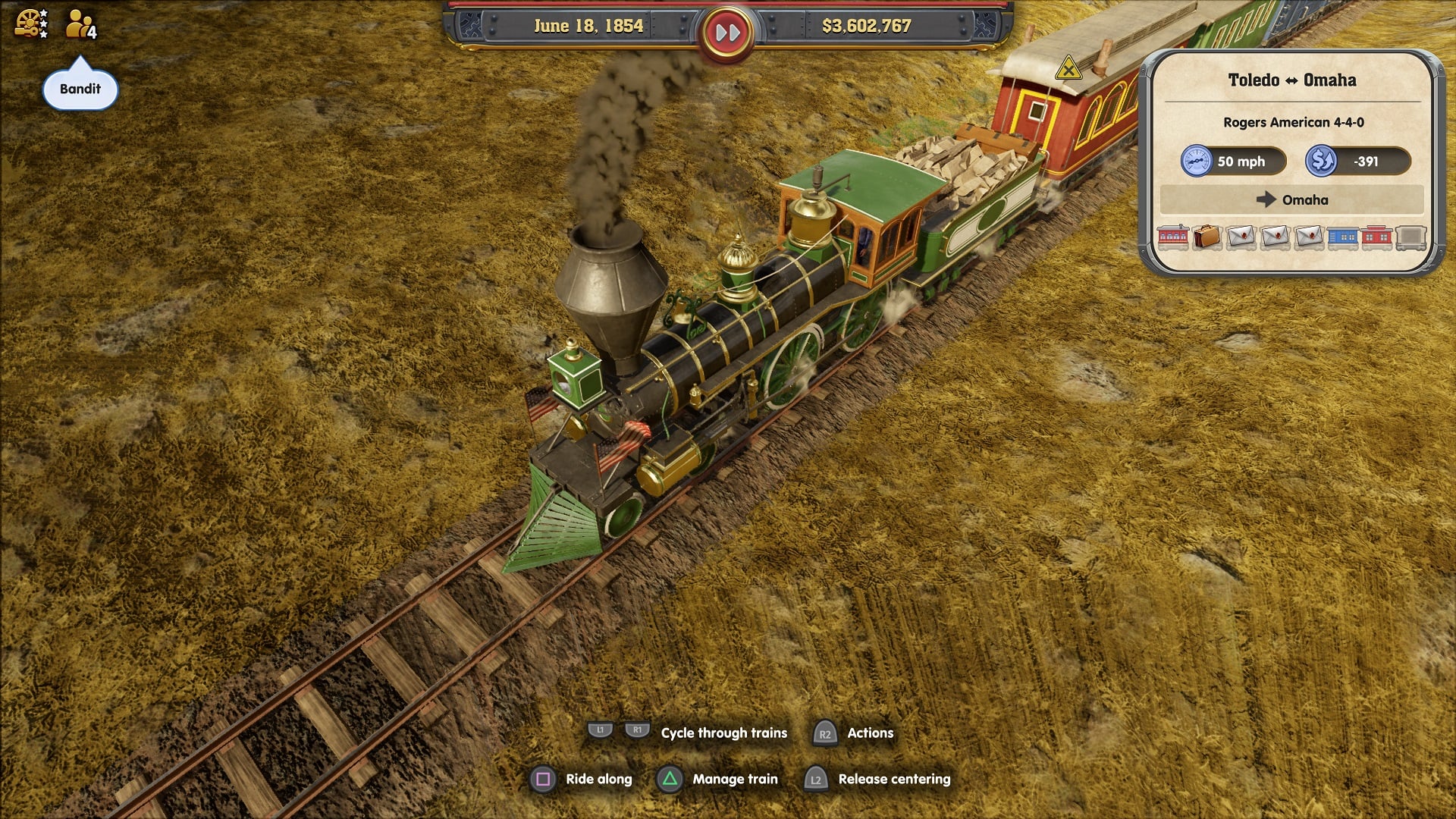 One of the things I love yet also dislike about the trains is the customisation. As I’m playing on the PS4, I’m limited in what customisations are supported. Once unlocked, you can equip your trains with either a refrigerator car (to get more food revenue), a dining car (to get more ticket revenue), a caboose (to get a bonus for your staff), and a mail car (to get more mail revenue) in order to adjust them to their set job. Using a mail car, for example, will use up one of your eight carriage slots but if your train is carrying mail then you will get 20% extra revenue.  So it’s swings and roundabouts as you plan out what purpose you want your train to have. The thing I dislike is, that’s the end of customisations on the console versions – you can’t paint the trains, name them, slap a company logo on them or even change their stats. I can see where the developers are coming from – they want the game to be historically accurate and I doubt in 1836 there were any trains with gold wheels and neon lights, yet the PC version has built-in Steam workshop support so they do have some level of customisation. I would love for them to bring out a DLC, paid or free, in the future with new fantasy trains like the one from Back to the Future or even the Harry Potter one.