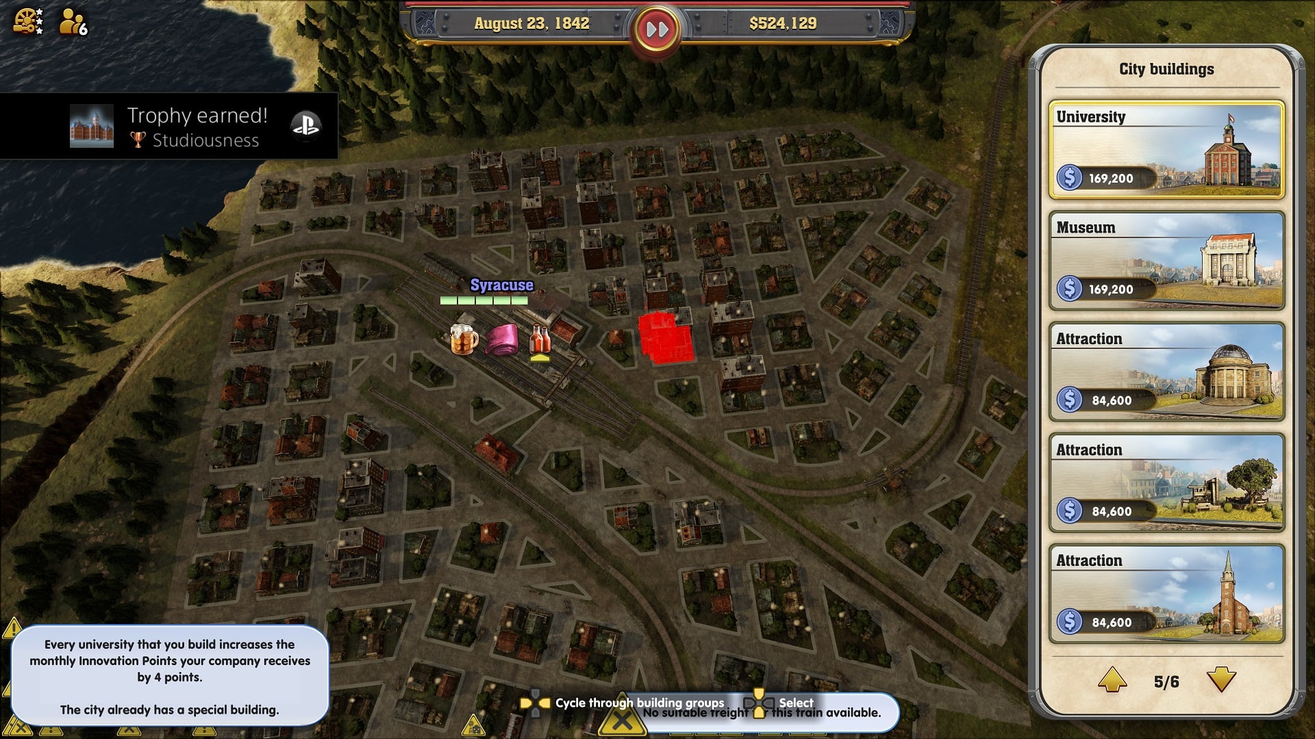 You can buy various buildings to help the growth of your cities such as a museum or a university.
