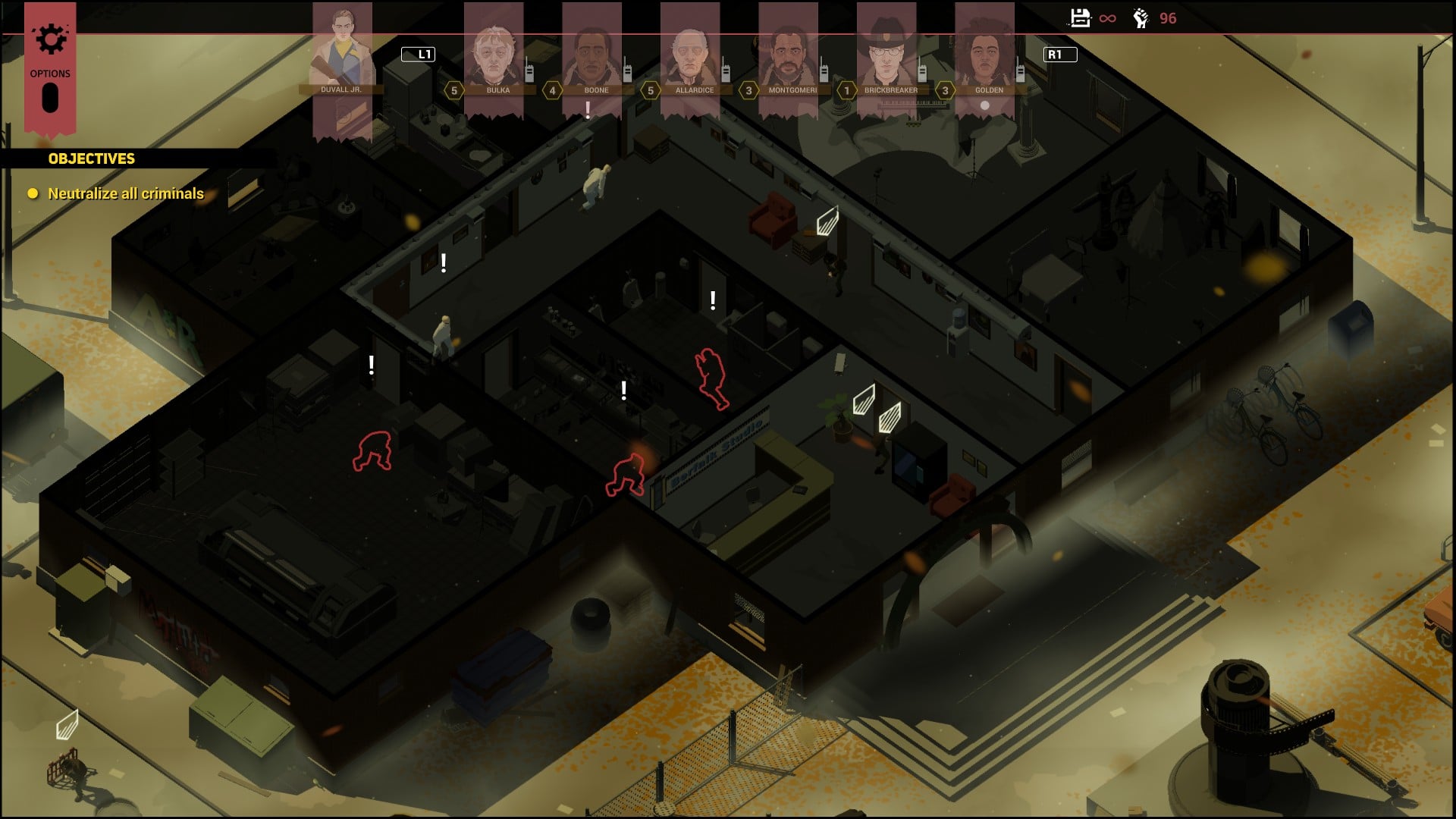 I think the combat in Rebel Cops is fun, although very, very harsh and unforgiving (even on Relaxed mode), and the visual style is very nice on the eye (as it was previously), but there are some aspects which irritated me. First of all, the game is quite dark when you’ve not opened a door – which makes sense. However, this means that you can’t sometimes see the door which you can open in order to gain access to the building – unless you randomly stand right next to it and see the hand icon. This is further made annoying by the fact the game is at a locked perspective, you can’t rotate the camera in order to see all four sides of a building.Â