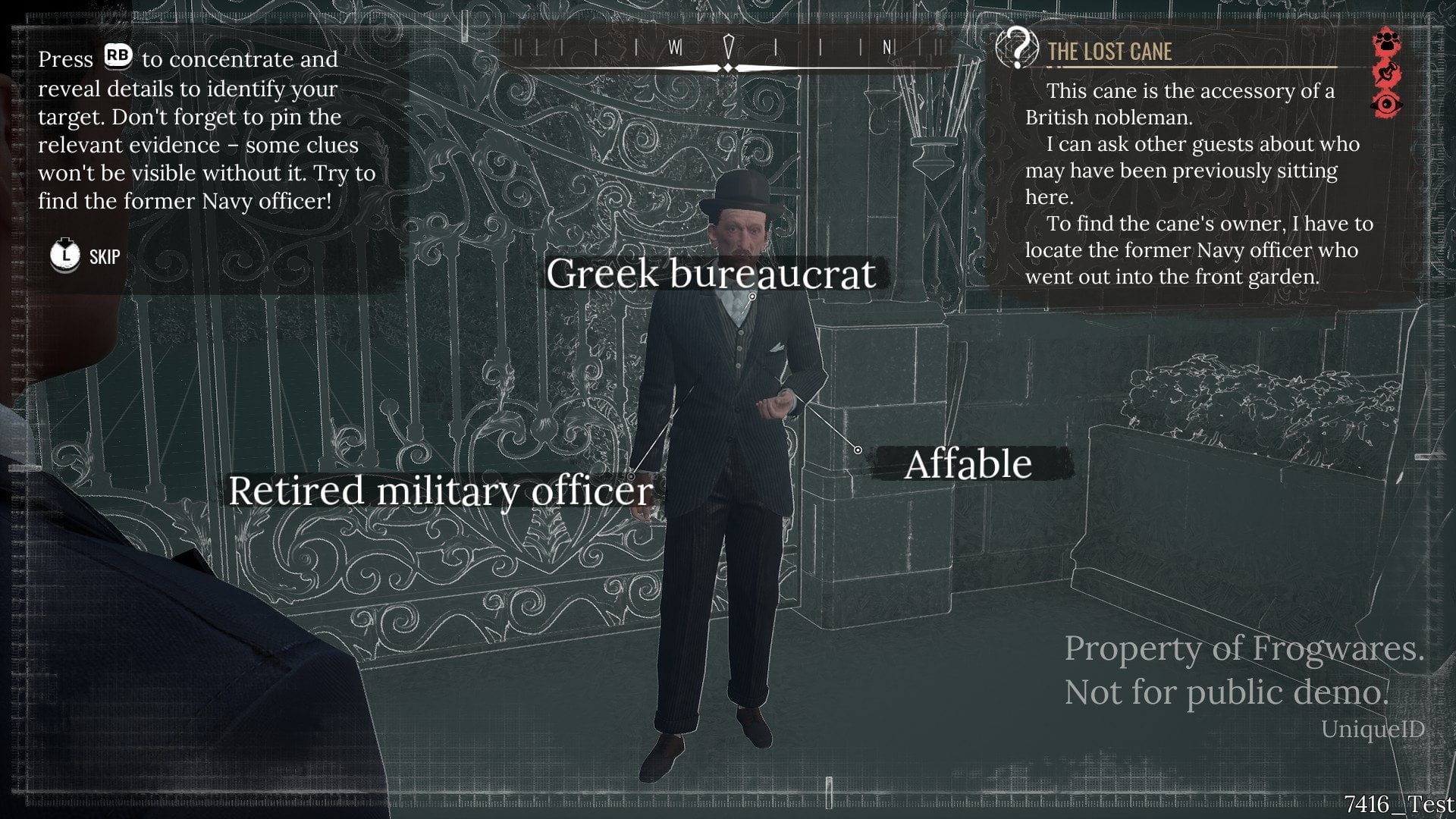 On command, you can enable Sherlock Vision (the game calls it Concentration, but it’s Sherlock Vision to me). This blue-tinted ability allows you to pre-judge every NPC you’re looking at, displaying three characteristics for that particular person. But why? Well, take the first case – returning a cane to its rightful owner. You’re given a vague description of a person who was talking to the owner, using that info you can determine if you’re looking at the correct person by enabling the SV mode and seeing if their key observational features match the info you’ve got pinned.Â