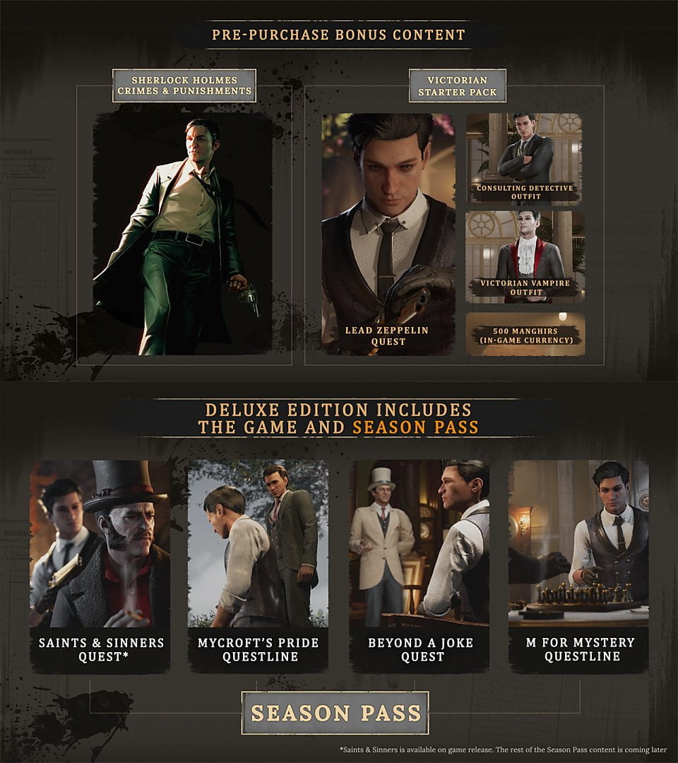 If you decide you wish to pre-purchase the game now (on any platform), you get access to the brilliant Crimes & Punishments immediately (I reviewed it HERE). Also, if you’ve played the game previously, it was re-released last year, with a new platinum trophy list! You also get a ‘Victorian Starter Pack’ which includes a quest, in-game credits for buying furniture and disguises, and a few outfits – including a vampire! Alternatively, if you pick up the Deluxe Edition, you get the above as well as the season pass – this includes two quests and two questlines (which I presume are multiple quests). Only one is there on release, but the others will release throughout the year.