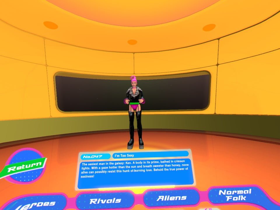 • Friendopedia. This is a glossary of all the characters you’ll see within the game, both friend and foe. You can scroll through them all and take a good look at the 3d models as they slowly spin around at a distance. I really enjoyed looking at the models and reading the summaries telling me about who they are – especially the ‘sexiest man in the galaxy’ – but there are two issues (which I mentioned previously). First of all, the characters are set quite far back, meaning you can’t get a good look at them as you can in other games with similar VR character viewers, and secondly, they all slowly rotate on their own, meaning you’ll be looking at their butts until they slowly turn to face you. Allowing them to come closer and giving you manual control of the rotation would make a lot of difference here.