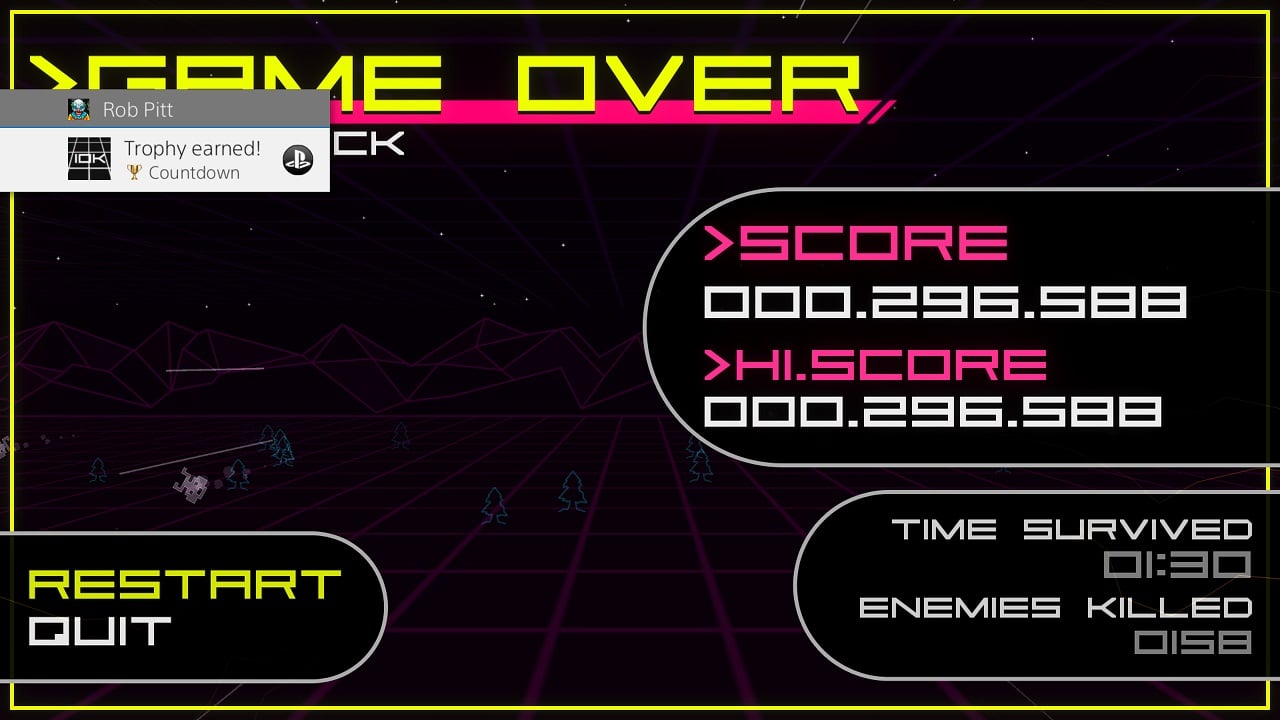 So, in terms of modes, that’s your lot. You can also take a look at your statistics which lists how many enemies you have killed, how many waves you have survived, etc… but that’s all the gameplay content in Super Destronaut DX. Graphically I really enjoyed the game, it clearly is a throwback to Space Invaders and it even has a rather delightful chiptune soundtrack and 8-bit sound effects within the game. If this game was £8+ I would have said that there isn’t enough content to justify the price as you can effectively complete all the trophies in less than 30 minutes if you’re focused enough. However, at £3.99 for both the PS4 and PS Vita version then sure, it’s a fun game to play, it’s quite addictive and you get two platinums for around two quid a plat.