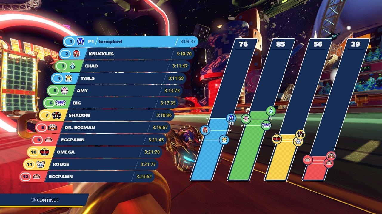 Does anyone remember Mario Kart: Double Dash on the Gamecube? I loved that game, swapping between the front and back driver as you stored items and used each characters unique abilities to win the race… Team Sonic Racing is nothing like that game (although I’ve seen a few people liken the two together). If I was to compare this game to any other, which has come out in the last few years, I would honestly say that it reminded me of OnRush, in a world where OnRush had an actual race-mode instead of the endless loops.Â
