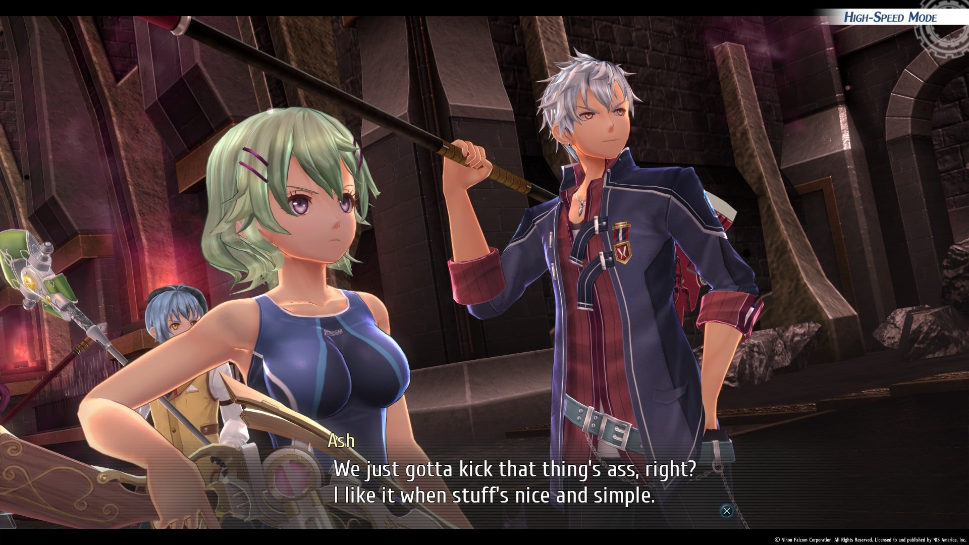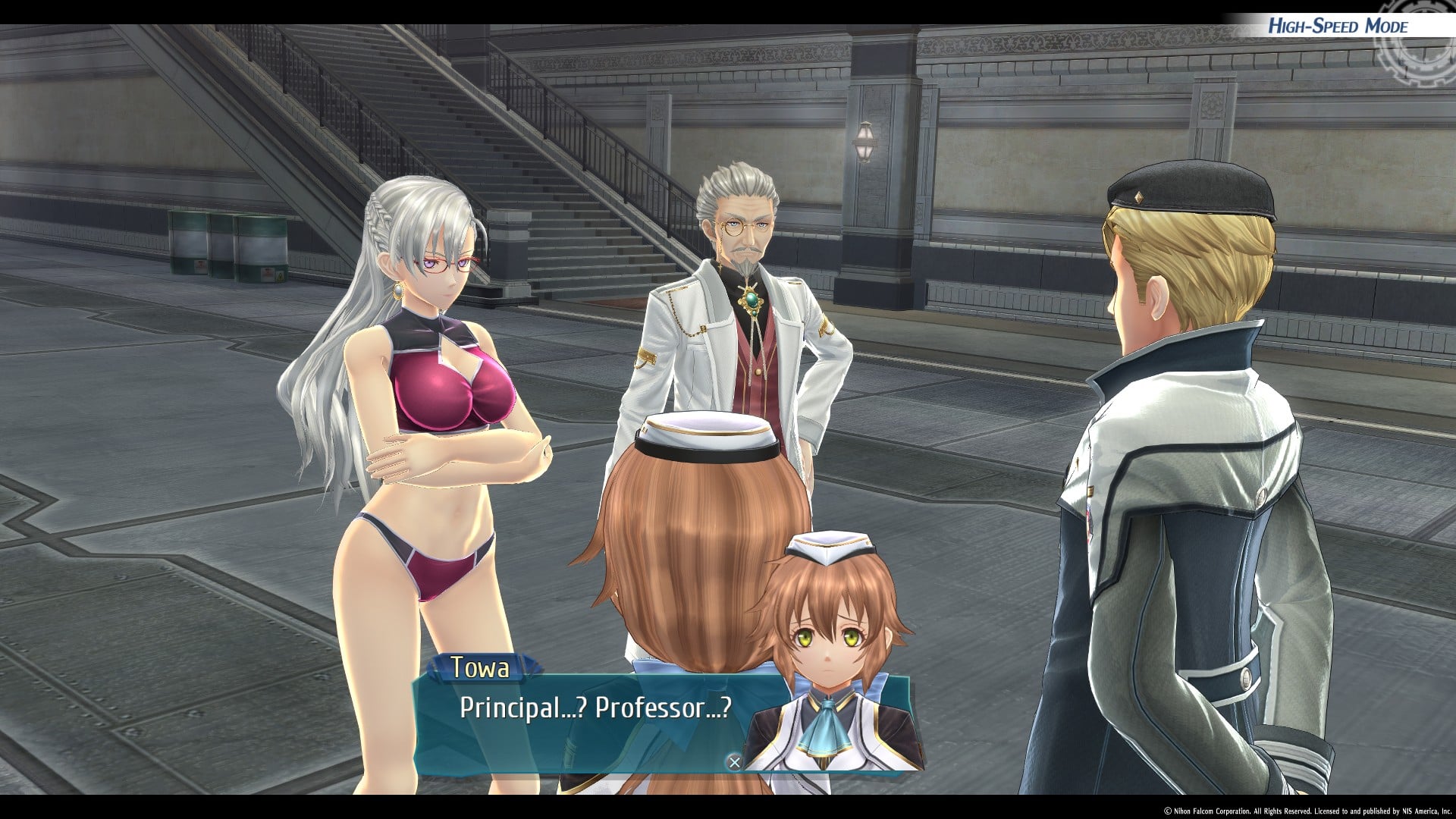 Just like the previous games, Trails of Cold Steel III doesn’t take itself too seriously. One minute you’ll be discussing secret orders and political affairs, then you’ll be taking part in a swimming competition against the principal of the school. Speaking of the principal, at one point you’re making your way through an air-vent (a new mechanic this time around) and she bluntly lets you know the vent is too tight because of the size of her boobs and demands you blow the wall open instead… There’s a lot of comedic moments throughout the game but also some rather dark moments which I won’t spoil for you.