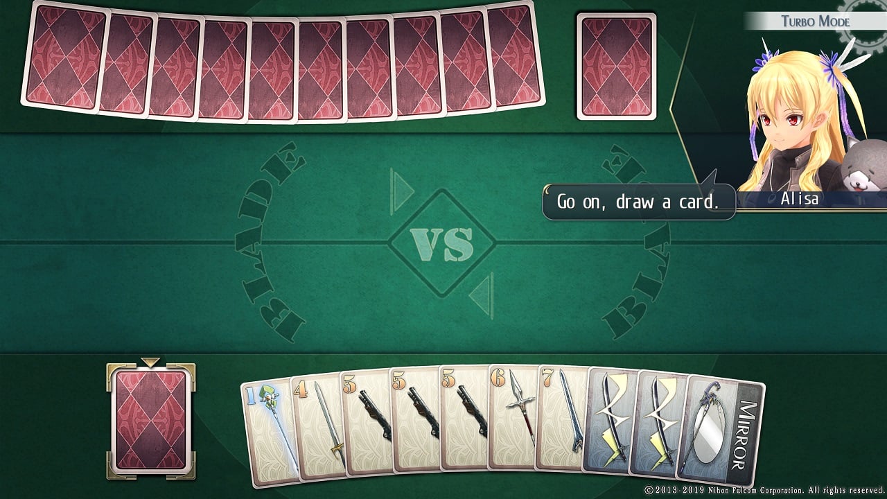 Fans of Tokyo Xanadu eX+ will be very familiar with this game, Blade is back! I absolutely loved playing this game within Tokyo Xanadu eX+, although in that game it was a necessity to get a trophy as you had to beat numerous people a number of times. However, in The Legend of Heroes: Trails of Cold Steel the game is played as you’re either on the train on the way to your next location, or when you have downtime within said locations. Whether you win or lose, you’ll get 50 points added to the relationship bond you have between Rean and the person you’re battling.Â