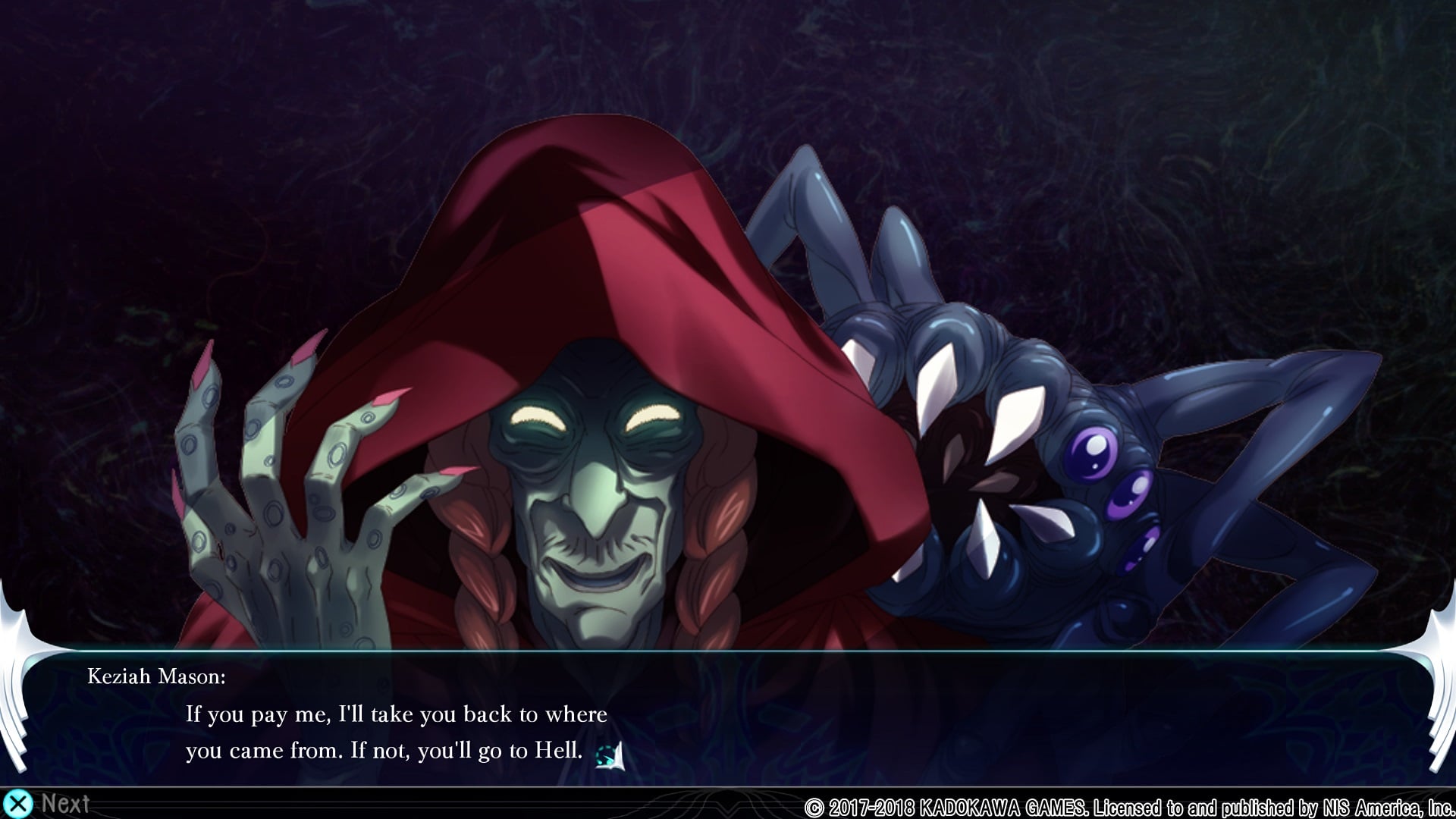 Also, if you die whilst playing The Lost Child – If Hayato dies (the others can die and it won’t initiate the end of the game) – then you meet the mysterious Keziah Mason who will allow you to return to the battle from the start if you pay enough gold, or return just before you entered the battle if you have enough Karma. This came in handy a few times as it allows you to retreat and grind a bit more if you have enough Karma to escape. If you don’t, then ‘Hell’ is your only option. Hell basically returns you to the title screen and you lose anything you did since your last save – so save regularly!