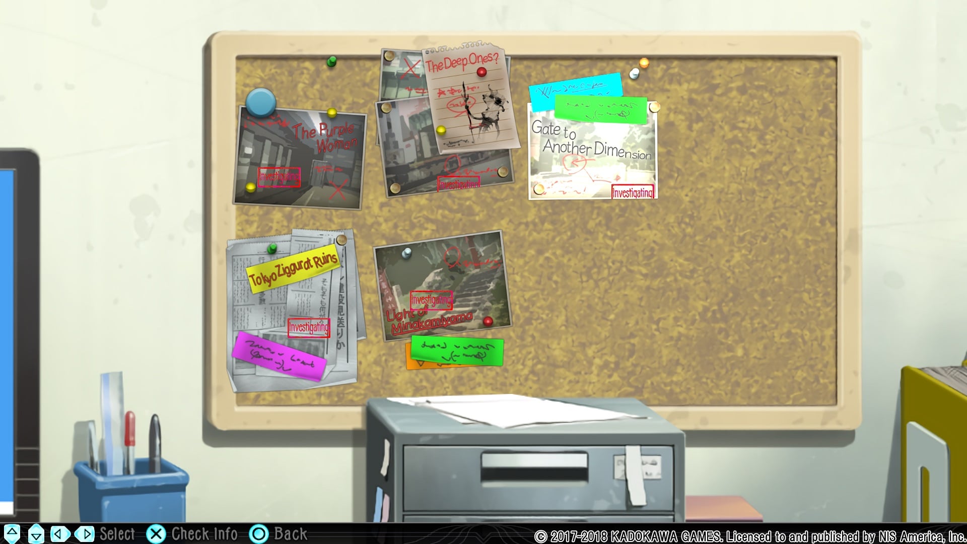 This is your official ‘home base’ – it’s here where you can save, stash items and get new investigations. This is also where the Chief Editor, Sarutani resides. He doesn’t really do much in the game at the beginning, but he is here for support and advice if you have any questions regarding your current investigations. However, I found him to be pretty useless as a conversation NPC, he just refills your investigations board while you are gone I suppose.