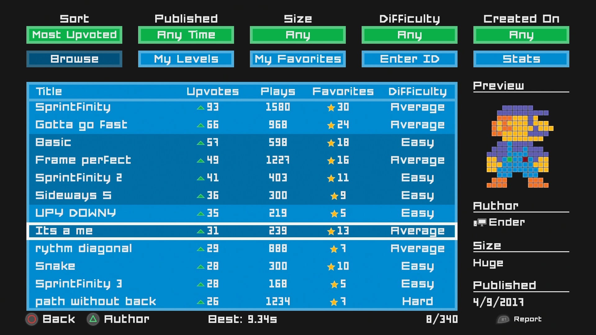 If you have completed all of the games 90 puzzles or if you fancy trying something new, there is a puzzle creator/level editor included in the game! Akin to Mario maker, you select what tiles you want, draw them out and then you are required to play the level and complete it before you are allowed to upload it for others to play. This is a great requirement as it stops people from spamming the game with impossible puzzles. At the time of writing this, there are around 340 user-created levels on there at the moment, ranging from easy to hard and from simple to a 1:1 likeness of Mario (below). The game is cross-play with PC in that levels created on either PC or PS4 can be played by both systems.