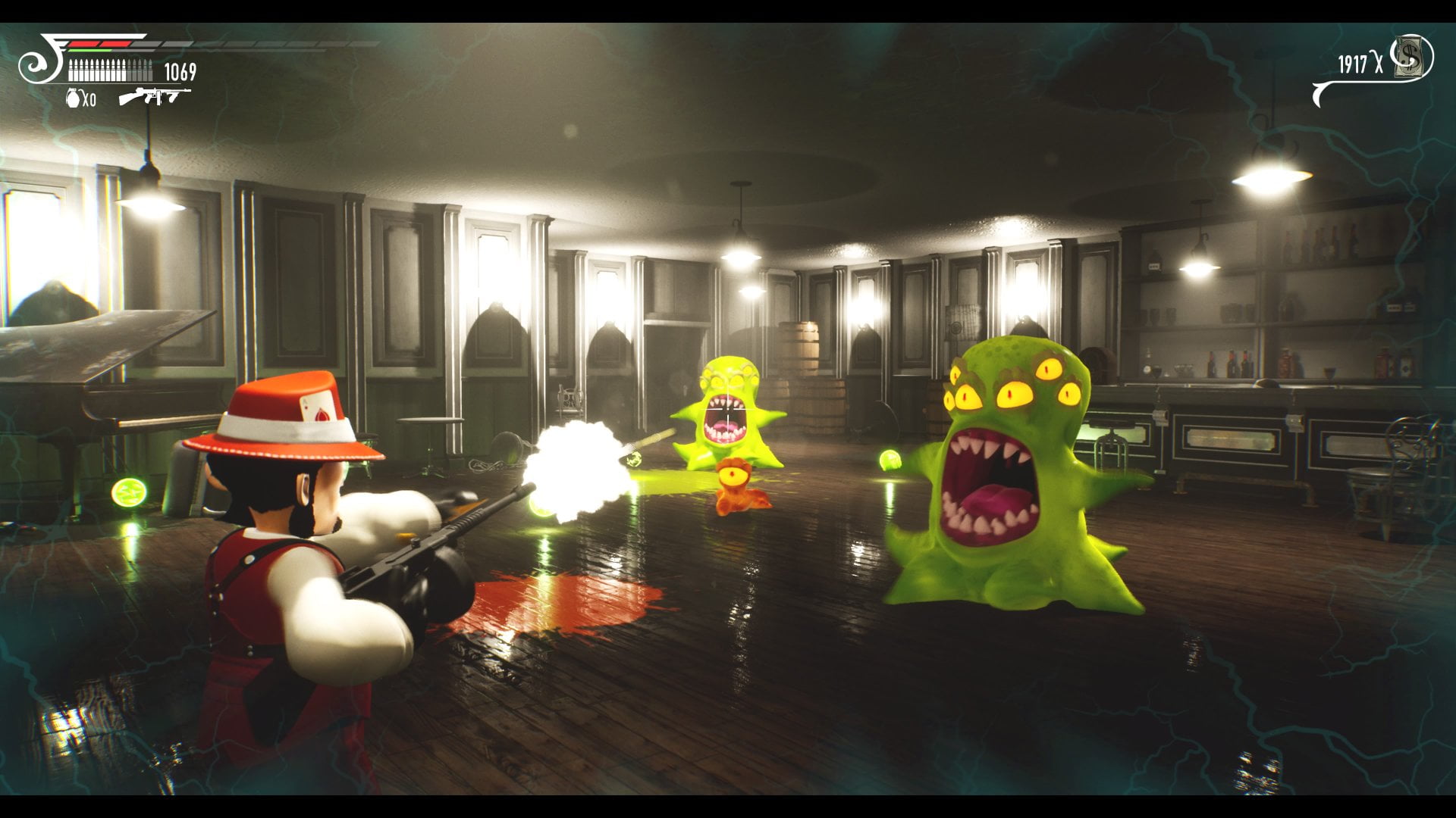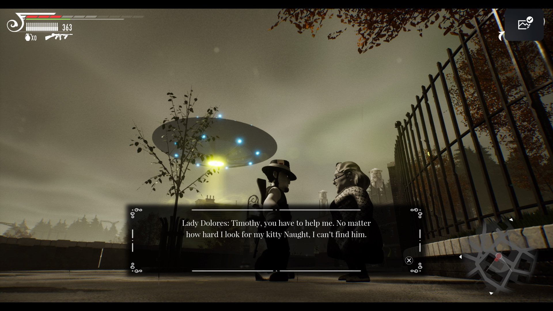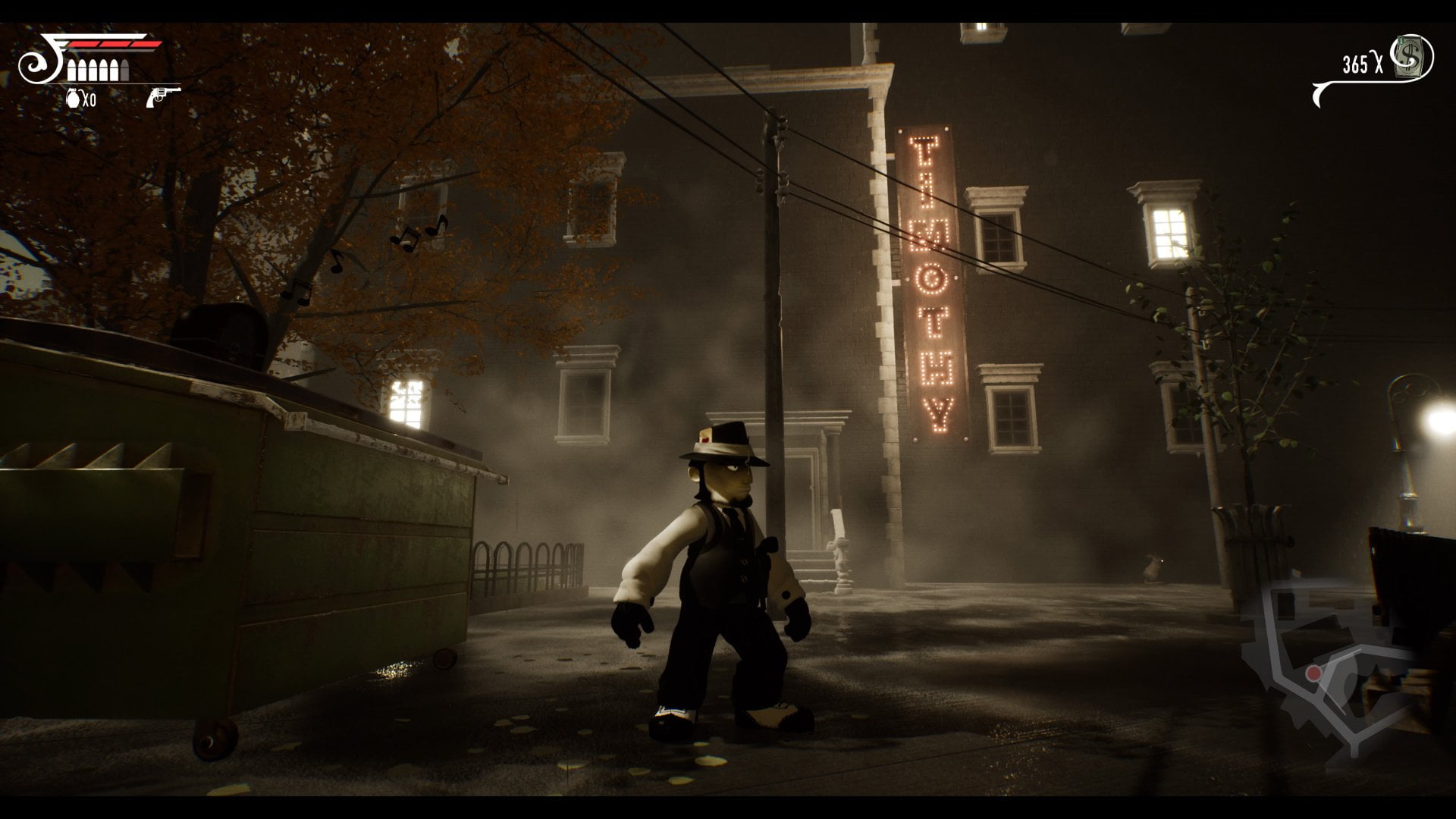 So, what’s the difference between Timothy vs. the Aliens and Timothy’s Night? To put it simply, a lot. Let’s start with the obvious, Timothy’s Night is 4K/60, whereas the previous was 1080/60, and the entire art style has changed. Originally, the game was a noir setting, everything within the world was black and white with only the aliens and the red playing card being in colour. The new edition has more of a sepia tone to it, rather than being colourless, with more objects and effects displaying colours; such as fires, items in the shop, crates, lights, and the collectables.Â