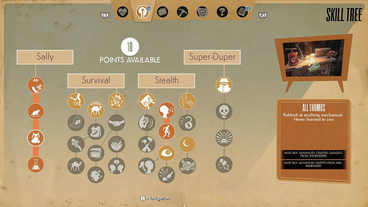 Just like with Sally, Ollie has a really annoying secondary mechanic – but in Ollie’s case, it’s a mechanic which has ultimately stopped me from playing We Happy Few. Ollie is diabetic and must inject himself every so often. This wouldn’t be that bad, but finding the syringes and honey is a pain! Not only that, when he has run out of his top-up, he’ll start shouting at random people as you walk past, thus making them instantly attack you, and his health will be instantly halved and you’re unable to increase it until he has had another needle. It’s a really annoying requirement and it’s basically broke the game for me. Not only that but because everyone hates him and he has no nice clothes, you can’t go to the main city without being involved in a fight every two minutes. Sure, you can make a boiler suit – but the materials to make it are in the city, the city you can’t move in without the suit…