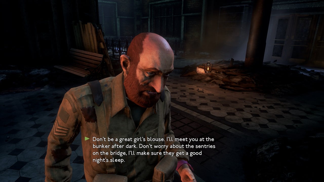 Ollie’s story begins as soon as Arthur returns from his mission to the army camp. After hearing about the revelation Arthur uncovered, he couldn’t just let it slide – he has to go and confront the general and find out why he didn’t know about it and why it wasn’t made clear before he sent off his daughter to be killed. That’s right, his imaginary friend, who you see a lot in We Happy Few, is actually the manifestation of his daughter. After this encounter and the destruction of his home due to quite a lot of TNT from recent invaders, Ollie sets out to uncover the full truth and reveal it to the world.