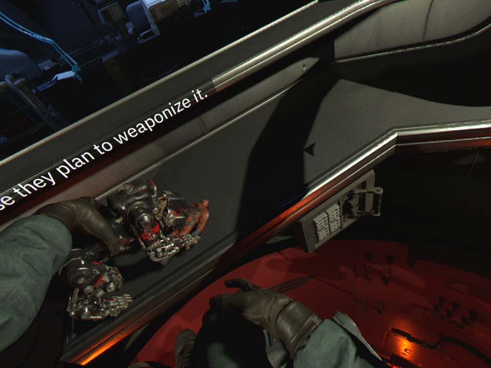 Regarding the space needed to play Wolfenstein: Cyberpilot, I thought I was okay as I have a small area that I use for seated VR – however, it wasn’t big enough. When the game’s narrative requires you to reach out and pull switches, I ended up knocking a few things over and having to readjust myself on the edge of my seat so I can grab things over to the side of myself and further down. It’s just something to be aware of, you’ll need about as much room as being able to put your arms out wide and reach things around the height of your lower waist and out to the sides at the same time.Â