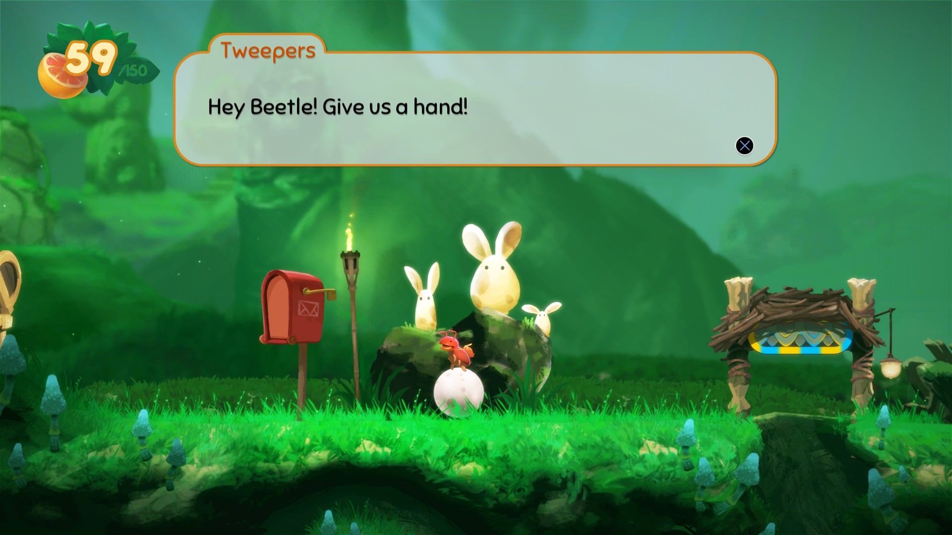 Our protagonist, Yoku, is a small beetle-like insect who constantly rolls around a ball that is attached to him. Don’t ask – I’ve not figured out why this is the case yet either. He has been appointed the new Postmaster of a faraway island, the island which is soon going to become the source of his big adventure! Upon landing on the beach (he sailed here on his ball), he meets the old Postmaster and received his first quest – go give the Postal Badge back to the Translator in the Village. Personally, the way the old Postmaster was in a rush to leave, it all felt a little fishy…
